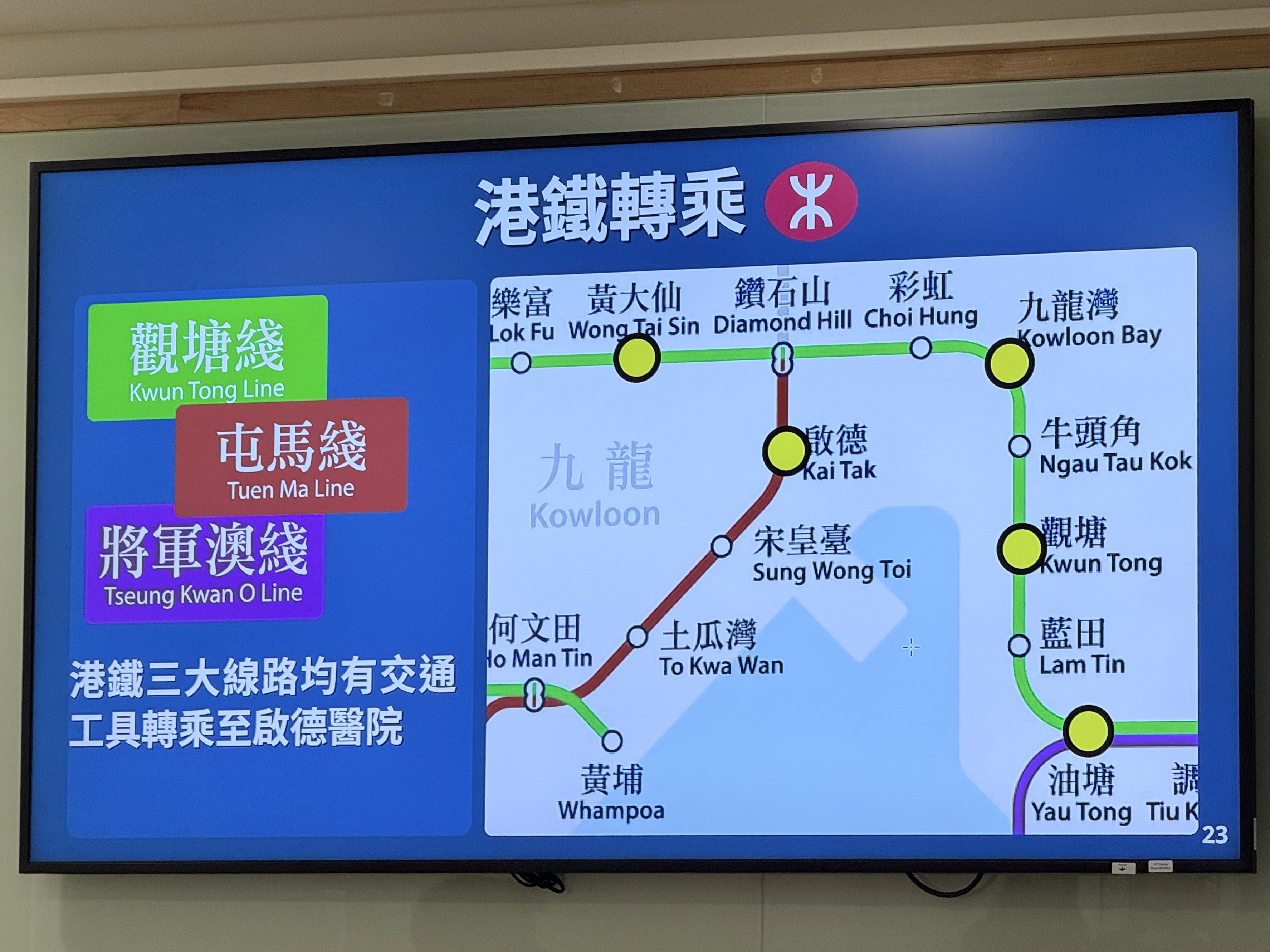 九龍中醫院聯網行政事務總經理雷沛然提到,啟德醫院公共交通網絡發達,共有14條公共交通路線,包括8條巴士線和6條小巴線,覆蓋九龍區主要的區域。港鐵觀塘綫、屯馬綫及將軍澳綫亦均有交通工具轉乘到達,相信方便市民就診。