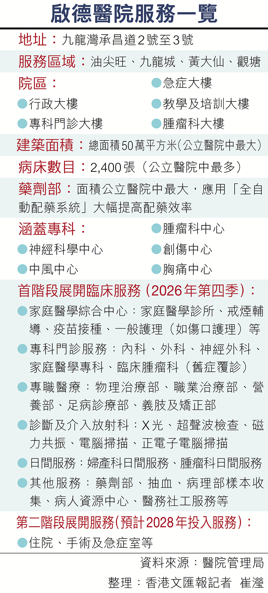 (香港文匯報記者 崔瀅)特區政府昨日刊憲,位於啟德發展區的新急症醫院正式命名為「啟德醫院」,今年10月起分階段投入服務,預計2028年全面投入使用。新醫院總建築面積約50萬平方米,設有2,400張病床及37間手術室,每年可服務140萬人次病人,將成為全港最大的公立醫院,接棒伊利沙伯醫院,成為九龍區的「公營醫療樞紐」。