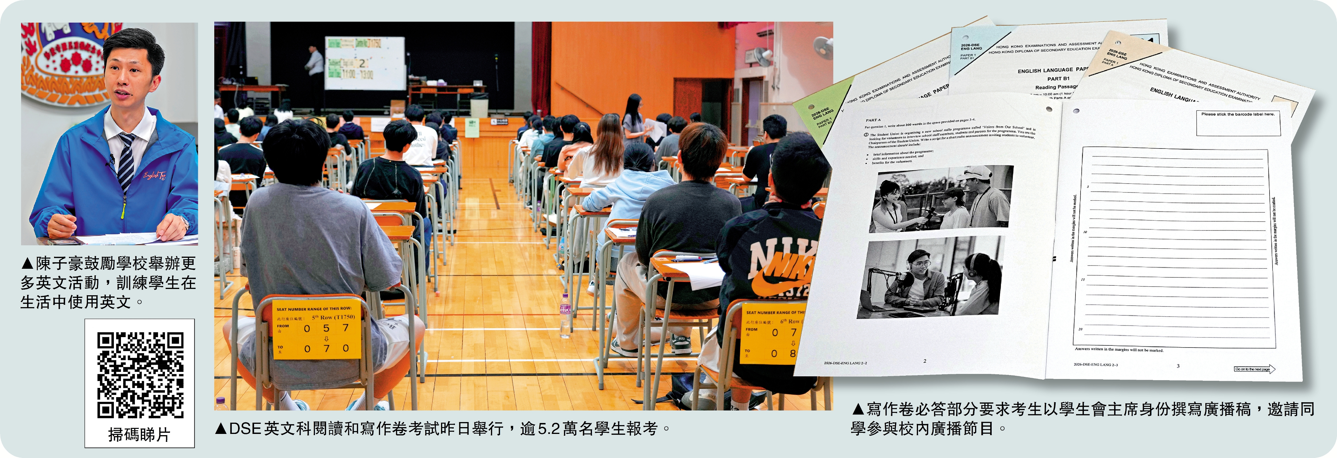 至於卷二寫作部分,陳子豪認為題目關注個人觀點、感受,而非前幾年的「家國天下」,直言懲罰「讀死書」的考生。他提到,必答題要求寫關於學校新廣播節目的廣播稿,與其任教學校新舉辦的活動不謀而合,認為相關經歷有助學生掌握題目。不過,他指出題目暗藏陷阱,「學生較少遇到這一體裁,可能意識不到廣播稿需要搶耳,或者重複部分信息。」