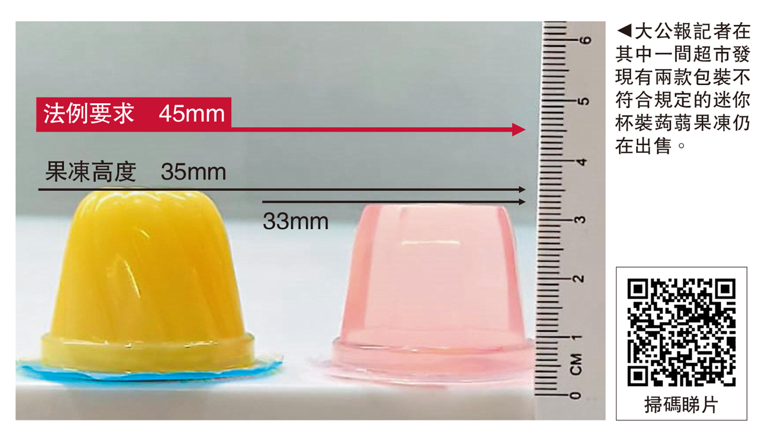 《2025年食物及藥物(成分組合及標籤)(修訂)規例》已於4月1日正式實施,禁止高度或闊度不超過45毫米的迷你杯裝蒟蒻果凍在港出售,其他預先包裝的蒟蒻果凍產品亦須在包裝上標示預防哽噎警告字句,違者最高罰款5萬元及監禁半年。