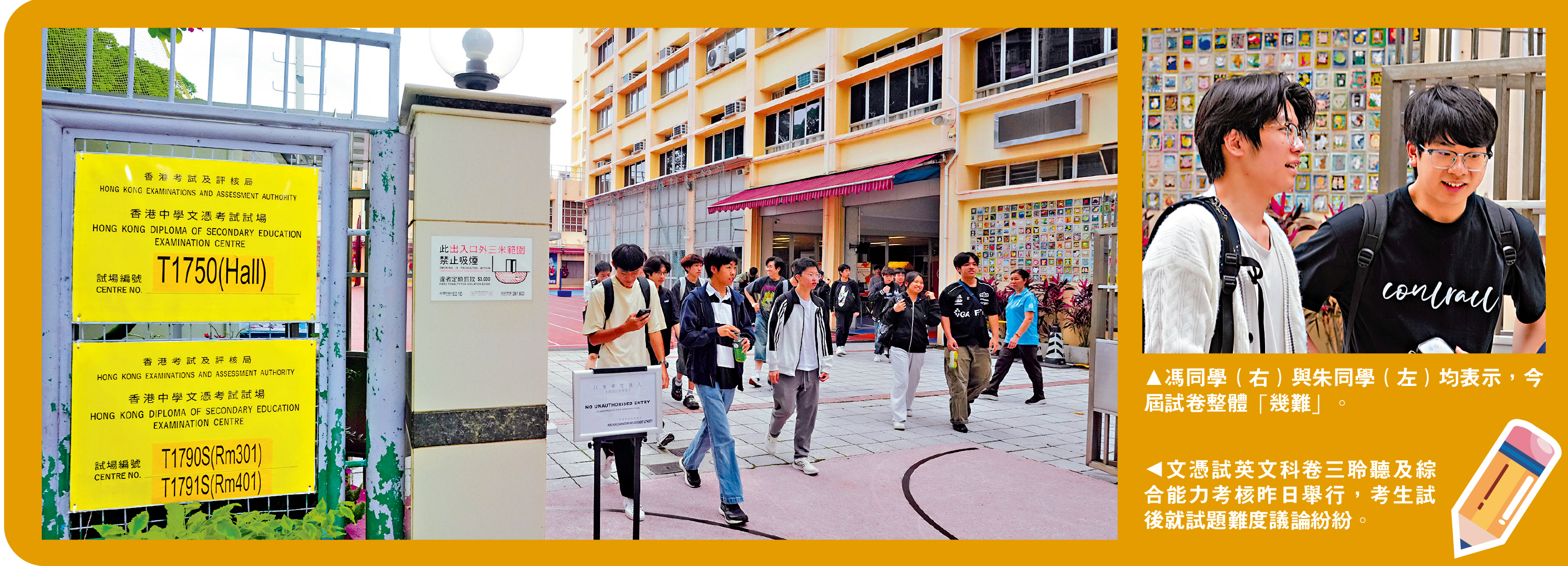 (大公報記者 游茜茵〈文〉 黃洋港〈圖〉)香港中學文憑試(DSE)英文科卷三(聆聽及綜合能力考核)昨日(11日)開考,約52700名考生於430個一般試場及約700個特別試場內順利應試。不少考生試後就試題難度議論紛紛。