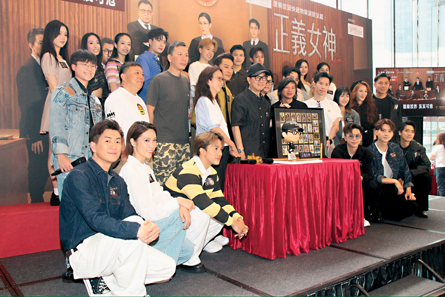 (香港文匯報記者 達里)譚耀文(阿譚)、周嘉洛、蔣祖曼、馬貫東等人昨日到商場宣傳熱播劇《正義女神》。主角佘詩曼(阿佘)雖然未能到場,但她預錄片段隔空支持劇集,並預祝總監製鍾澍佳(佳導)生日快樂,大會同時送上佳導的人形蛋糕和《新聞女王》演員的簽名閃卡。《正義女神》雖然已在內地播畢,但無礙香港收視創佳績,首周跨平台收視有23.2點,觀看人數約149萬人次,暫成本年香港收視最高的劇集。