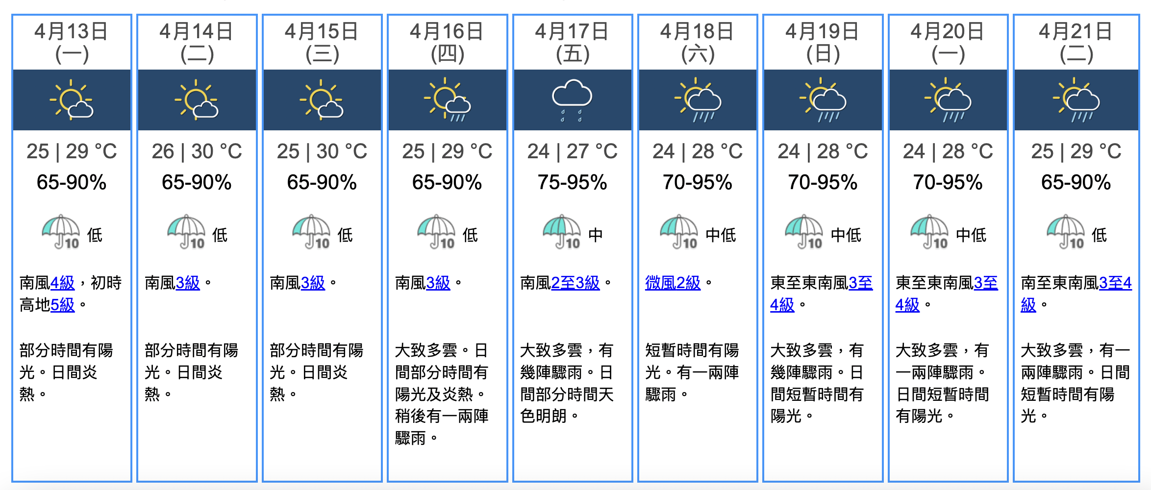 據九天天氣預報顯示,本港周四(16日)稍後開始有驟雨,周五(17日)有幾陣驟雨,日間部分時間天色明朗,其後至下周初都時晴時雨。