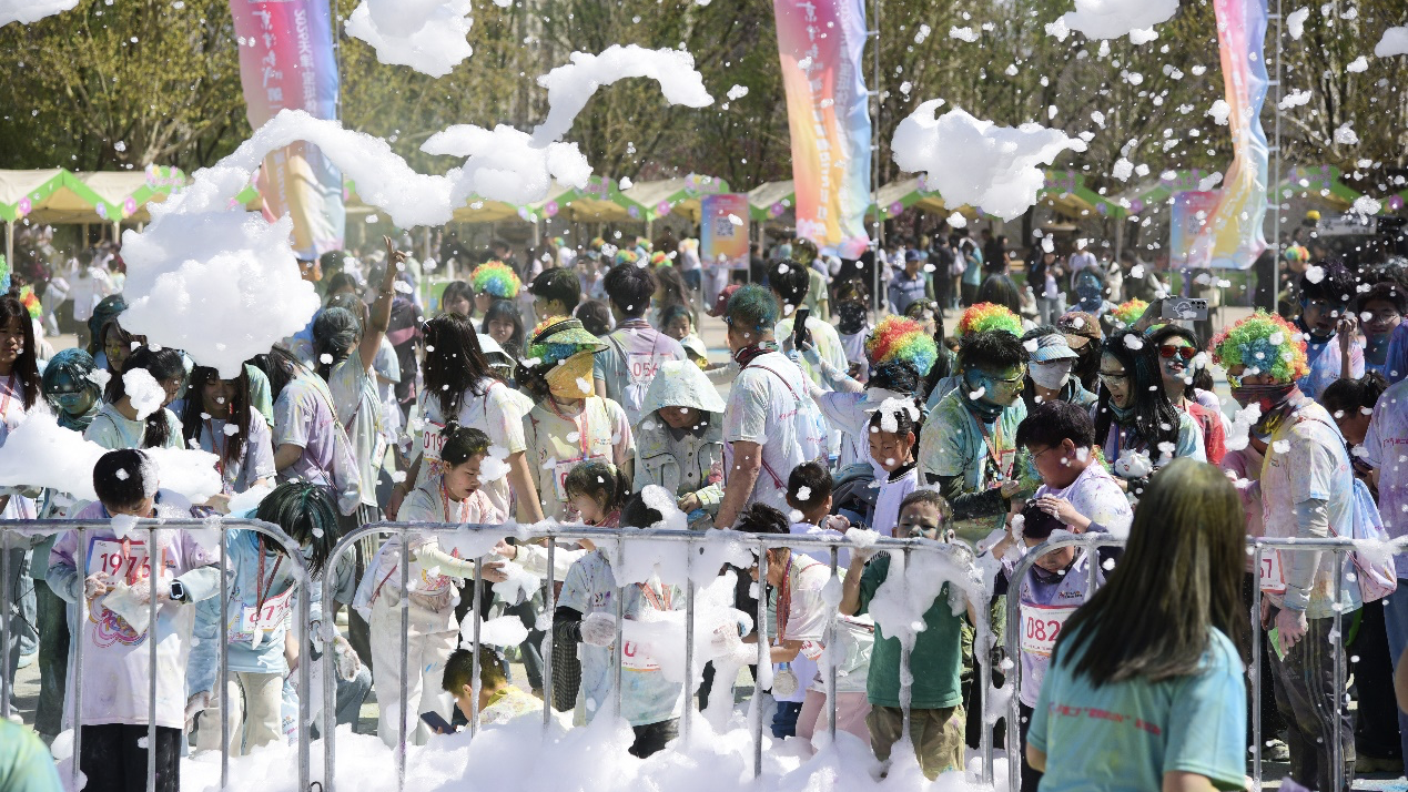 活動現場設置海棠彩虹主題打卡區、七彩手印牆,電音派對、街舞快閃、樂隊演出輪番上演,萌趣NPC與參與者熱情互動。隨着發令聲響,3000餘名選手拋灑彩粉,海棠花瓣與彩色粉末交織飛揚,5公里生態賽道沿花海鋪展,一路春光爛漫。