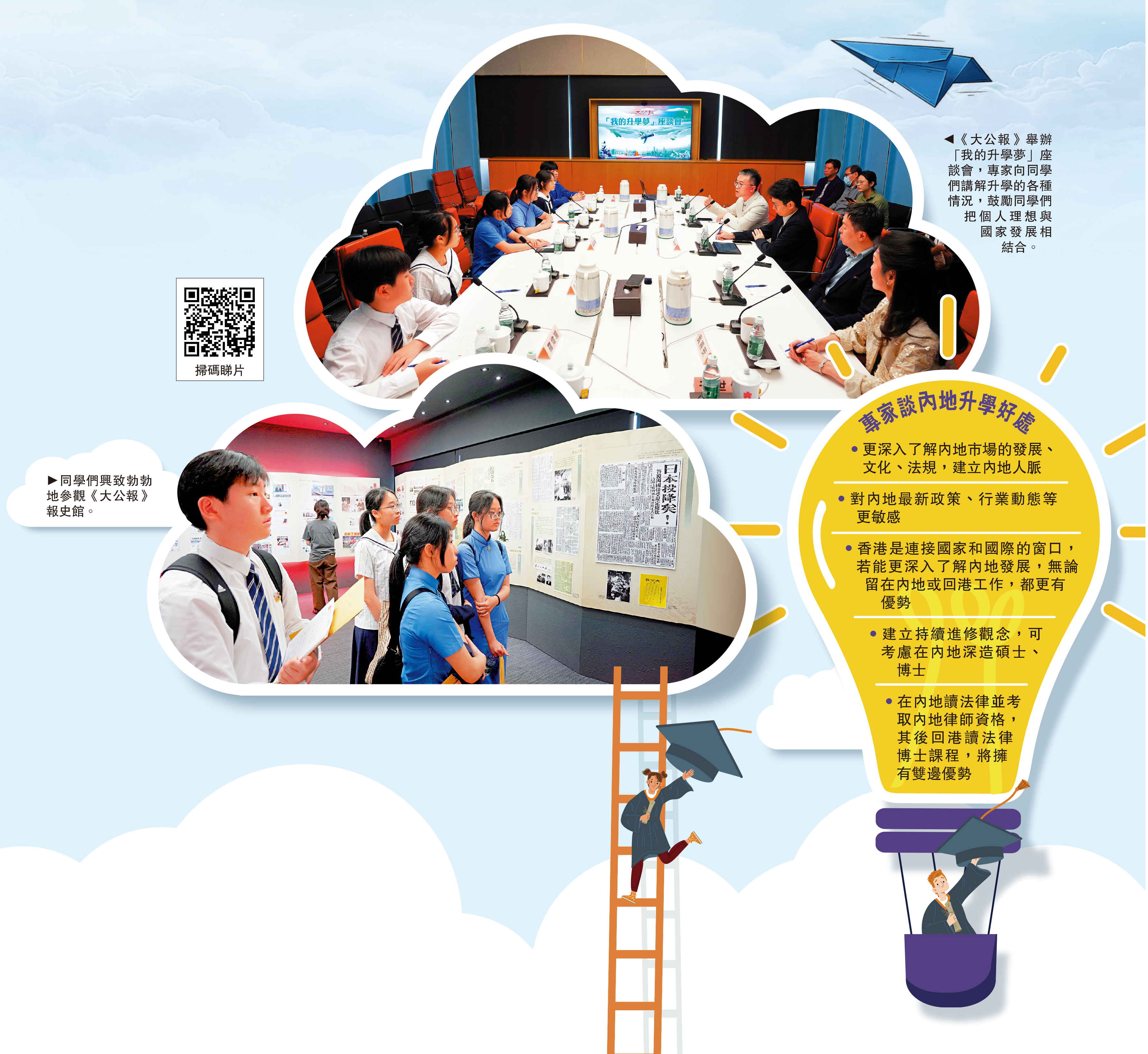 (大公報記者 盛德文、李永青、湯嘉平<文> 麥潤田、黃洋港<圖>)中學文憑試(DSE)正緊鑼密鼓進行中,不少學生都在思考未來的升學路向。《大公報》於上周六(11日)舉辦「我的升學夢」座談會,教育局副局長施俊輝、財經事務及庫務局副局長陳浩濂、香港執業大律師嚴康焯,以及基滙資本執行合夥人吳燕安,與六名來自多間知名中學的學生,分享求學與工作的心路歷程,解答升學疑問。