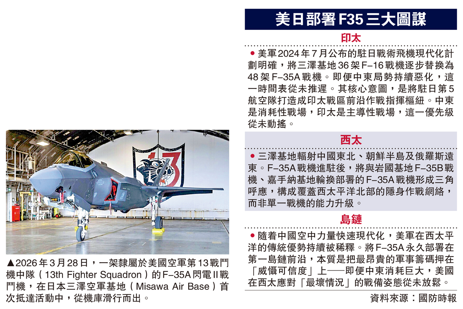 大公報訊援引央視新聞報道,2026年3月28日,日本三澤基地,首批4架F-35A戰鬥機平穩降落,標誌着這款第五代隱身戰機正式在日本實現永久部署。該基地36架F-16戰機預計換裝擴編為48架F-35A,鞏固所謂「美日同盟空防戰力優勢」。