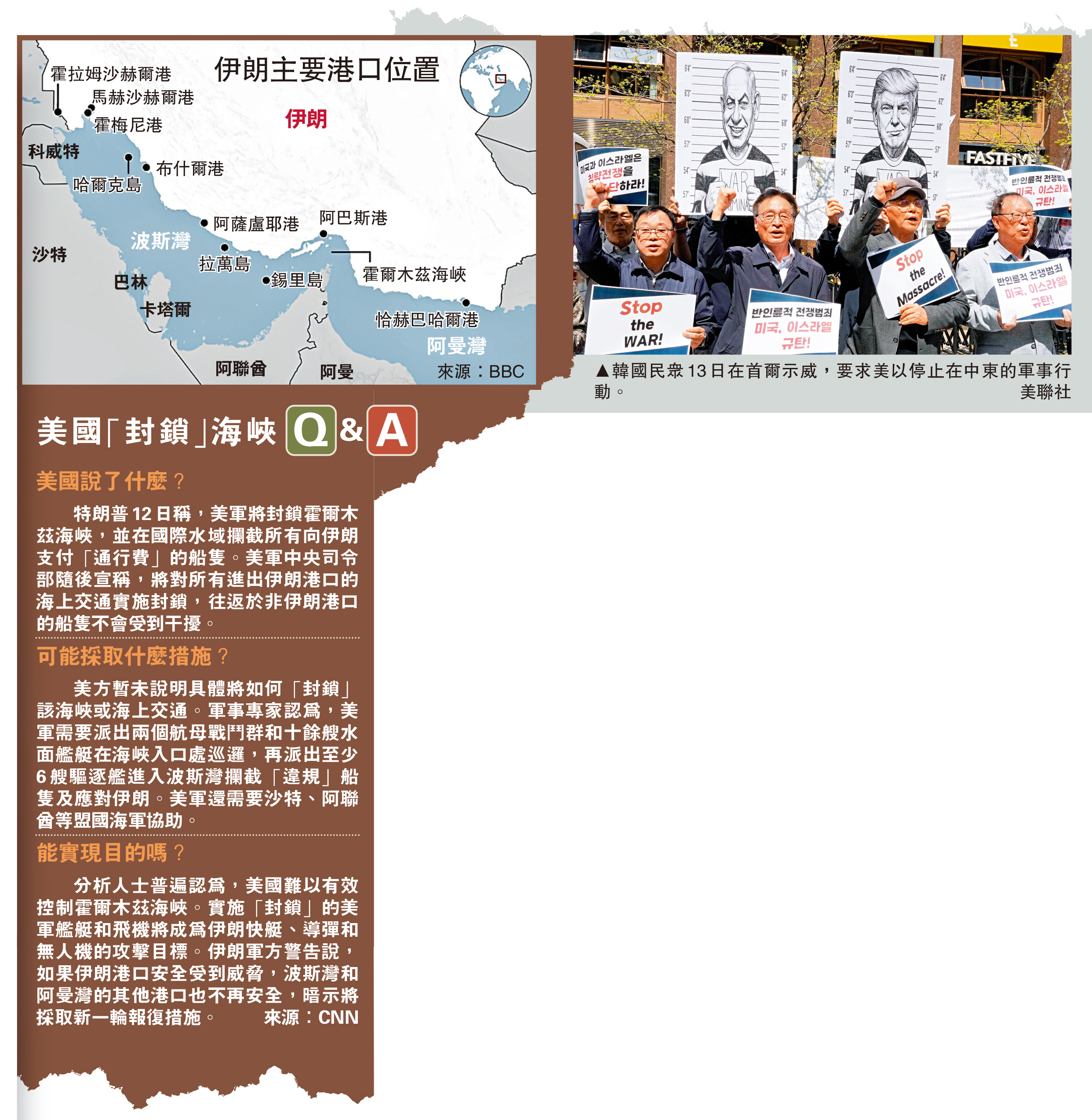 (大公報 記者 郭嘉)美軍宣布根據總統特朗普的命令,自美國東部時間13日10時(本港時間13日22時)起,對所有進出伊朗港口的船隻實施封鎖。此舉令中東緊張局勢再次升級,伊朗譴責美國企圖封鎖霍爾木茲海峽,是「海盜行徑」,並警告說,任何軍事船隻意圖靠近該海峽都將被視為違反美伊停火。分析人士指出,美國企圖從伊朗手中奪取霍爾木茲海峽這一戰略水道的控制權。國際海事組織秘書長多明格斯指出,封鎖海峽有違國際法。