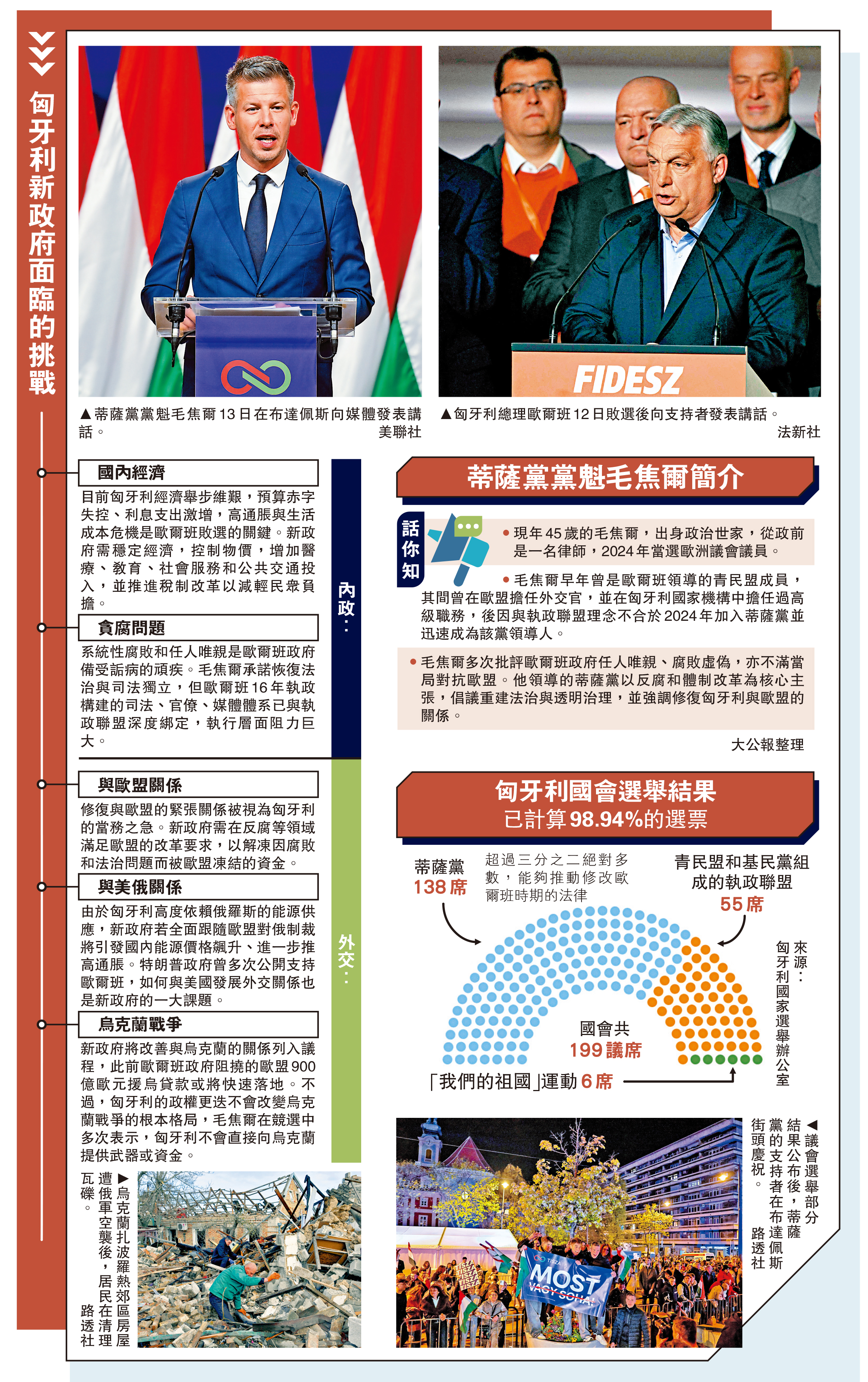 大公報綜合報道,匈牙利政局一夜變天。當地時間12日晚,匈牙利國家選舉辦公室公布初步計票結果顯示,現任總理歐爾班領導的執政聯盟在國會選舉中落敗,由毛焦爾(原譯馬扎爾)領導的蒂薩黨獲勝,這意味着歐爾班自2010年起連續16年的執政生涯正式落幕。這場選舉備受外界關注,牽動美歐俄多方博弈,極有可能對歐盟以及烏克蘭戰爭未來走向產生深遠影響。