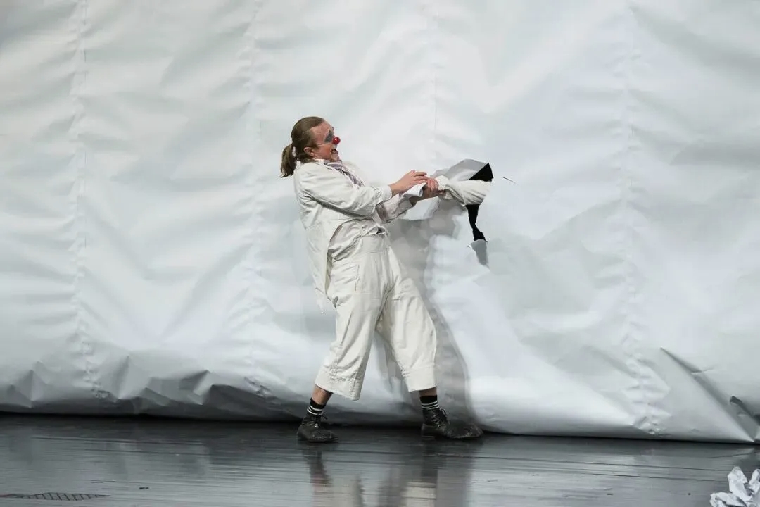 整部作品以一張普通白紙為核心線索,由多個趣味十足的短篇章串聯而成。舞台上,演員從清掃廢紙的日常場景切入,原本平淡無奇的紙片彷彿被賦予生命,時而追逐演員,時而變形扭曲,時而堆疊成各種奇幻造型。