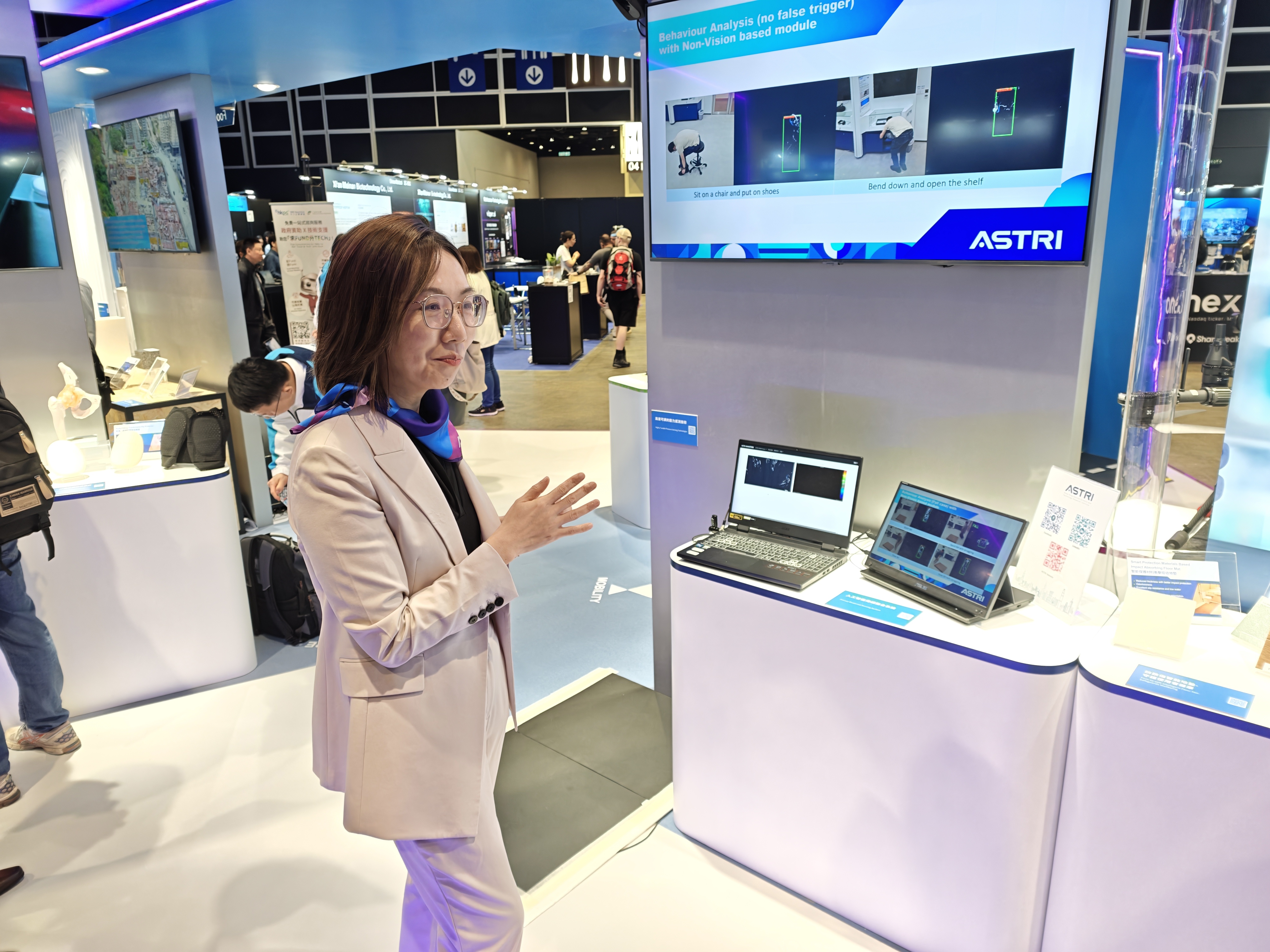 據介紹,應科院還推出了一套全方位長者防跌解決方案。應科院首席科技官黃瑩介紹,方案結合了行為預測與警示系統和防跌傷智能地墊,可以預測並感知長者跌倒風險並提供防護,目前該科技已在部分護老院試行。