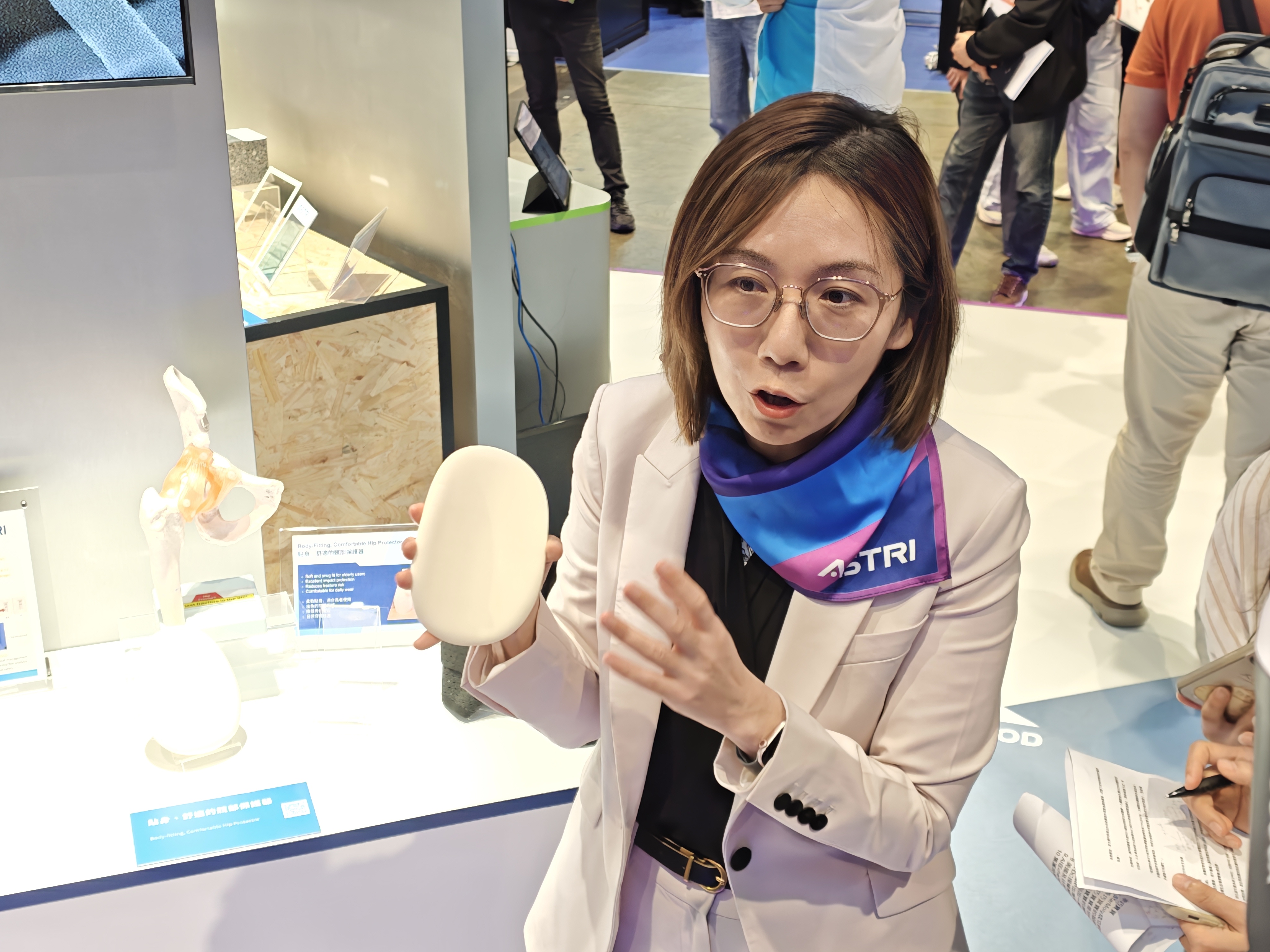 應科院的展位以「引領創新·突破界限」為主題,聚焦「醫療健康」、「食品科技」、「智慧生活」、「出行技術」四大領域,展示了約40項可供商用的創新技術,包括內置芯片、能即時收集病人維生數據的「安心貼」,可觸摸感知水果成熟度的手套,以及藉5G遠程控制的塔式起重機等。