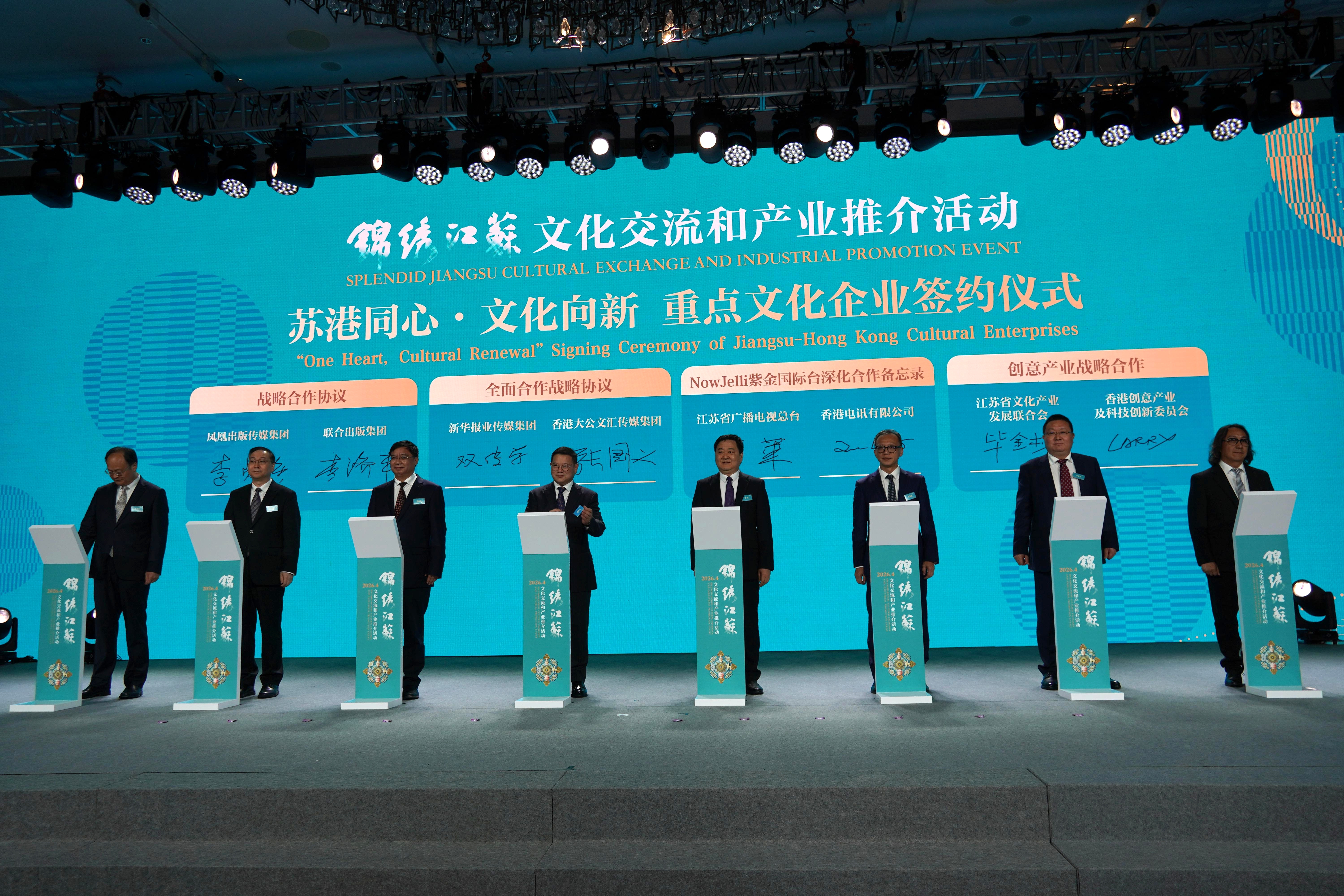 香港大公文匯傳媒集團副董事長、總編輯張國義,新華日報社黨委書記、社長兼新華報業傳媒集團董事長雙傳學;江蘇省廣播電視總台黨委書記、台長、集團董事長葛萊,香港電訊集團公司個人業務事務及收費電視董事、總經理蔡偉健等兩地重點文化企業代表分別簽署合作協議,推動蘇港文化合作「開花結果」。兩地共同發表《蘇港創意產業合作倡議》,決定共建兩地創意產業合作交流平台,開展常態化對接與交流活動,並聚焦文化IP、數字文創、文旅融合、科技賦能等領域,推動項目合作與市場拓展。