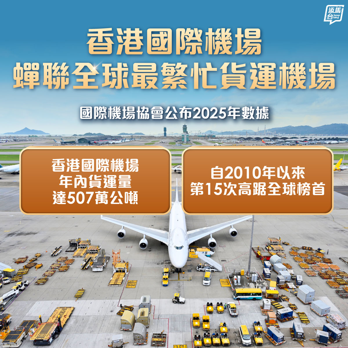 據國際機場協會今日(14日)公布的2025年全年數據,香港國際機場年內貨運量達507萬公噸,蟬聯全球最繁忙貨運機場,是自2010年以來第15次高踞全球榜首。