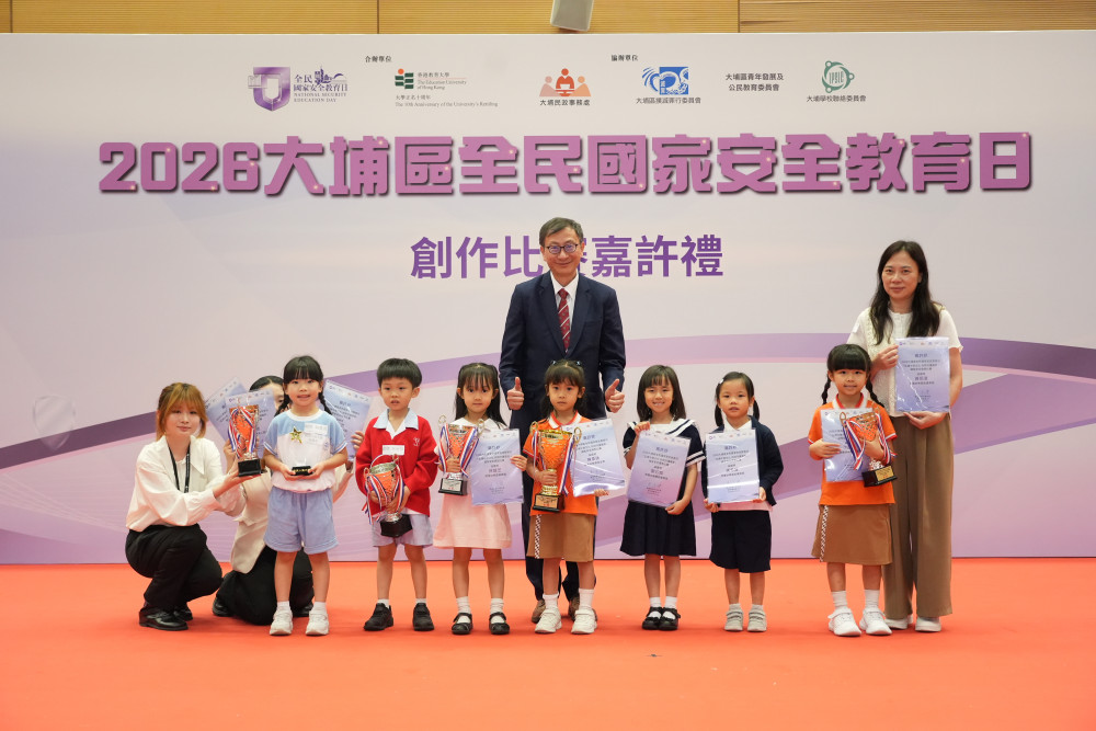 大公文匯全媒體報道,香港教育大學(教大)聯同大埔民政事務處,今日(4月14日)於教大大埔校園舉行「2026年大埔區全民國家安全教育日」創作比賽嘉許禮。出席活動的嘉賓包括律政司副司長張國鈞、駐港國家安全公署副處長張騰化、教大校長李子建、大埔民政事務專員鍾慧婷等,多位教育界及地區代表亦到場支持,一同見證學生的學習成果。