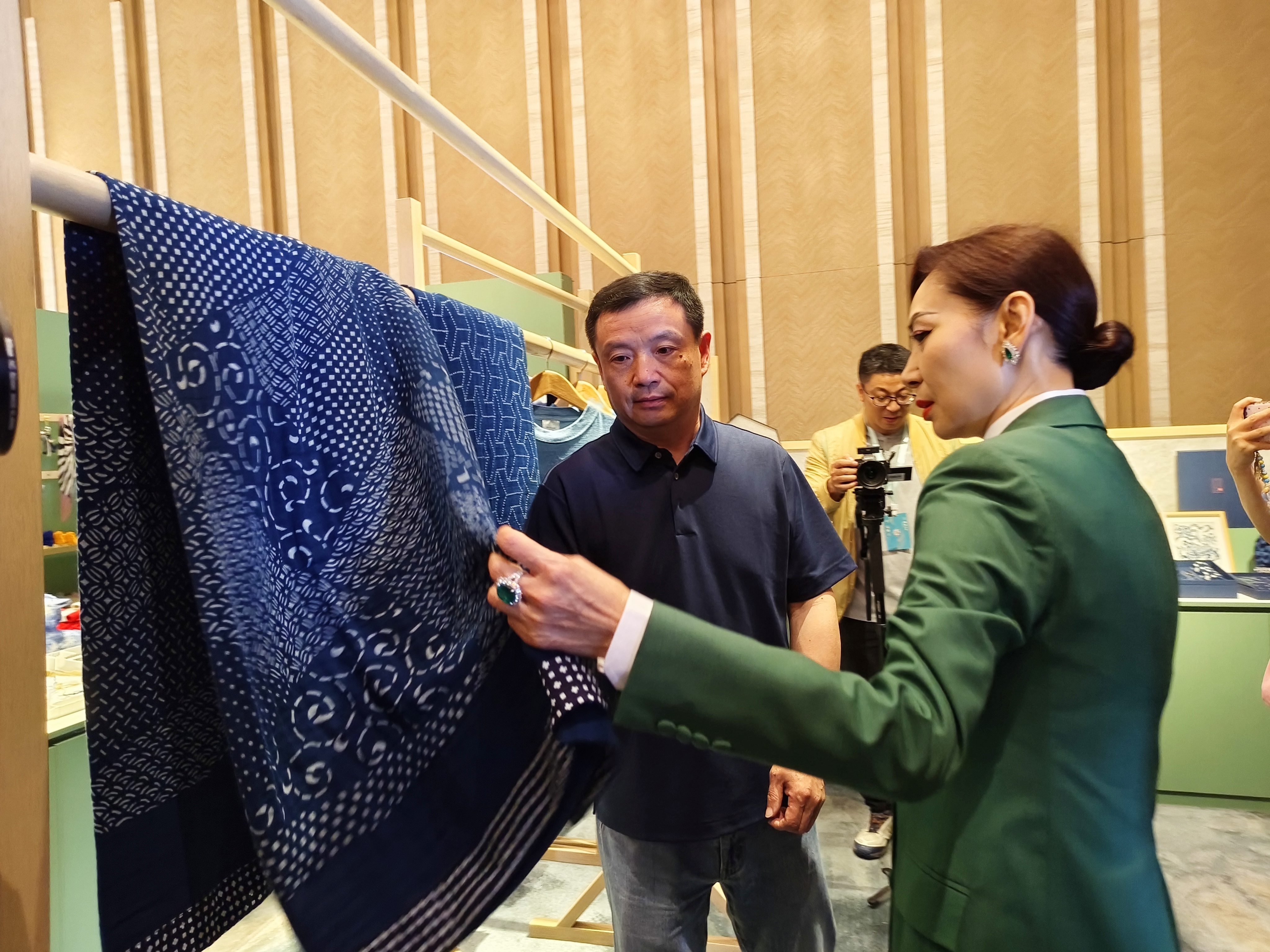 很多香港嘉賓和市民一走進展覽展銷現場,就被各種巧奪天工的「非遺」精品吸引。鄺美雲和友人更是流連於多個品牌展位,併當場掃碼購買了國家非物質文化遺產——南通藍印花布製作的嬰兒被等展品。據南通藍印花布省級傳承人江榮介紹,南通藍印花布是江蘇省南通市特產,其染料是從板藍根等純天然植物中提取,對嬰兒和成人都沒有危害和刺激。