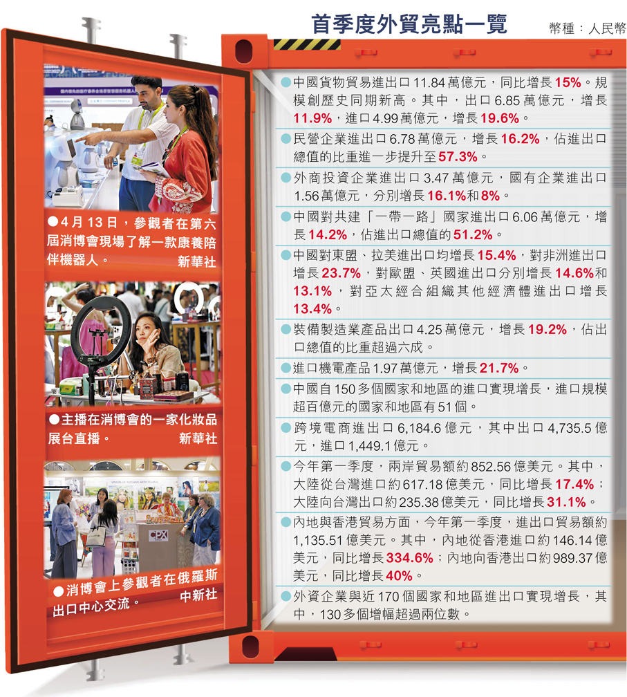 王軍指出,一季度進出口數據具備規模創歷史同期新高、各類經營主體全面增長、市場多元化進一步鞏固拓展、出口新動能持續發力、內需擴大帶動進口增長等5個特點。他特別提到,中國民營企業進出口6.78萬億元,增長16.2%,佔中國進出口總值的比重進一步提升至57.3%。同時,多元化市場方面,中國對共建「一帶一路」國家進出口為6.06萬億元,增長14.2%,佔進出口總值的51.2%。