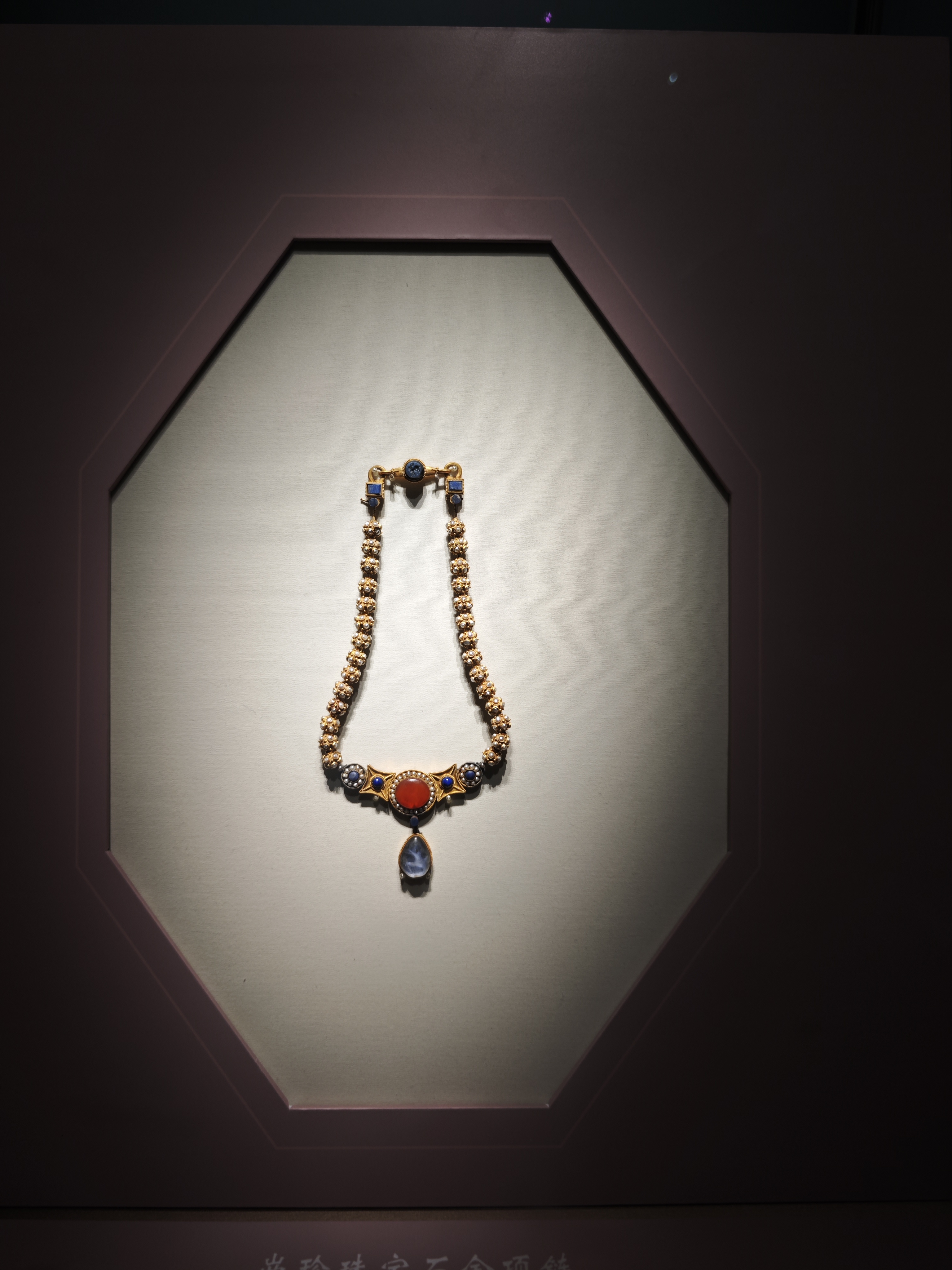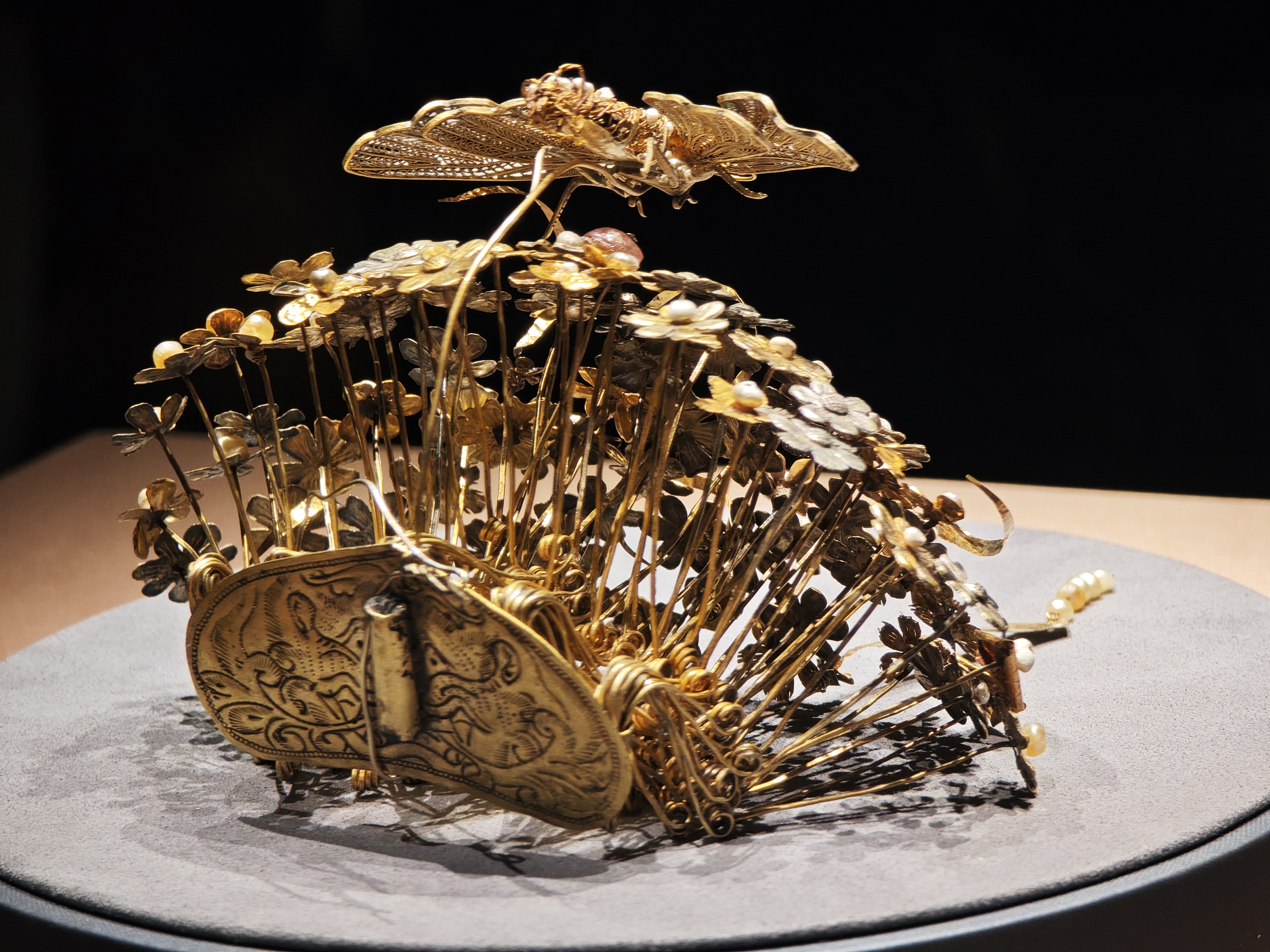 鬧蛾金釵是此次展覽的重磅展品。隋代是金銀釵簪的繁盛期,這件金釵以金片為托,六瓣形金花、三角形金荷葉、穿孔小珍珠等組成花瓣,頂部立一隻金絲嵌珍珠的飛蛾,體現「鬧蛾撲花」的巧思,佩戴者行走時金釵輕微搖曳扇動,頗具動感。趙玉亮介紹,這件文物出土後狀態欠佳,雖有過展出記錄,但更長時間是在庫房裏,「經過七八個月的修復,這次是系統修好之後的首展」。