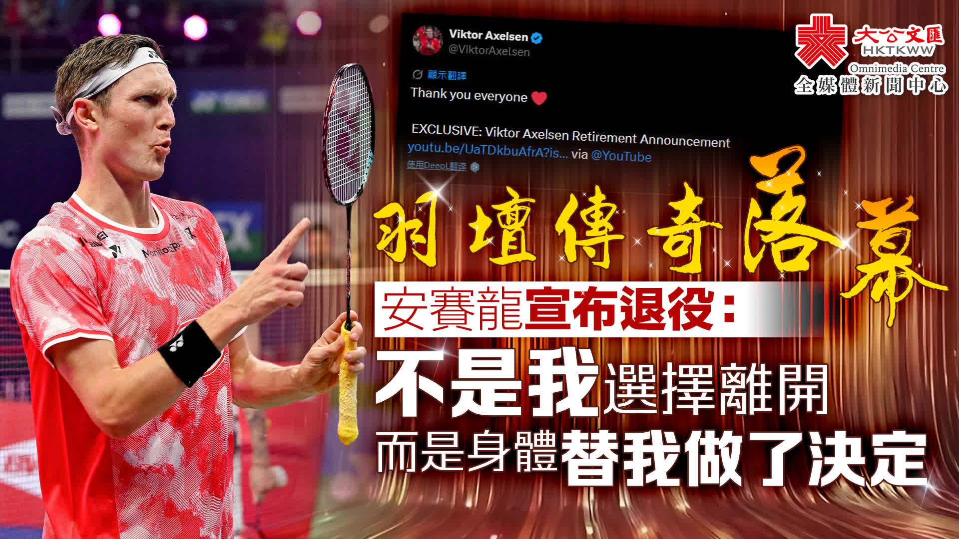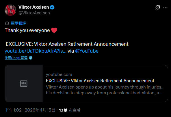 (大公文匯網 記者 林奕彤 綜合報道)2026年4月15日,丹麥羽毛球名將安賽龍(Viktor Axelsen)通過個人社交賬號發布簡短致謝訊息,正式宣布從國際羽壇退役,這一消息隨後在全球羽壇迅速傳開。儘管世界羽毛球聯合會及丹麥羽協尚未發布官方聲明,但由本人親自確認,已被視為其職業生涯的最終定論。