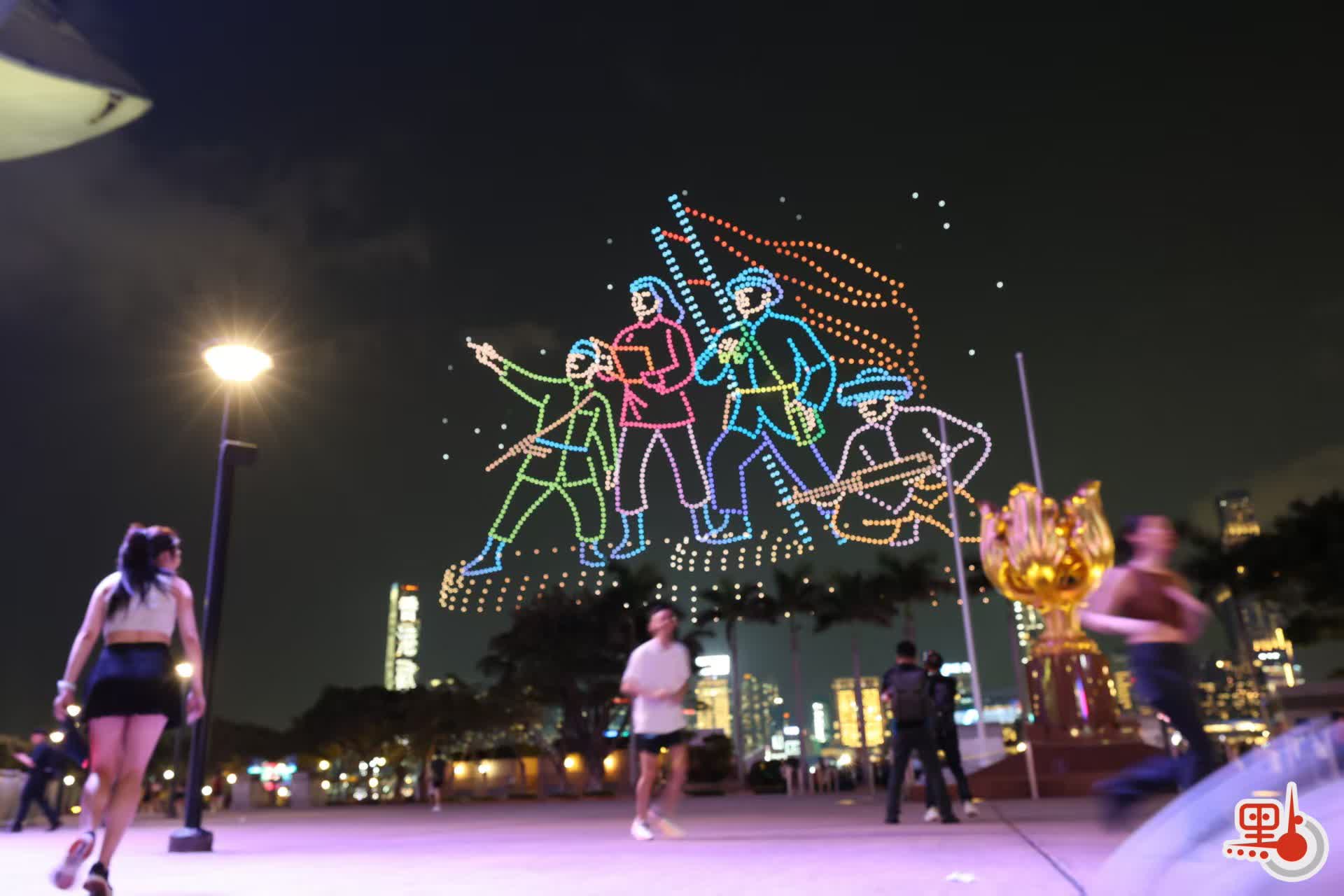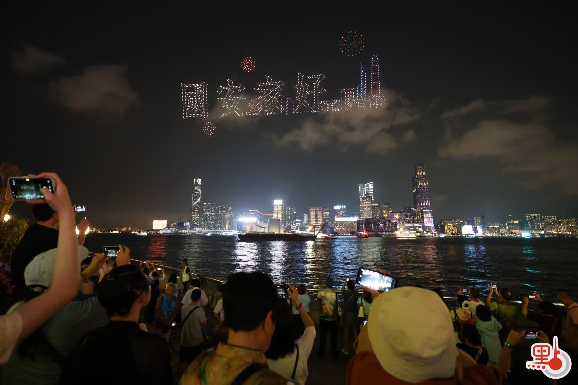 約2000架無人機在維港上空升起,以動感光影藝術,演繹本港青年學生以國家安全為主題創作的作品,包括國寶大熊貓、長城與金龍、中華白海豚躍出海面等。表演尾聲則以維港背景連同「國安家好」字體作結。