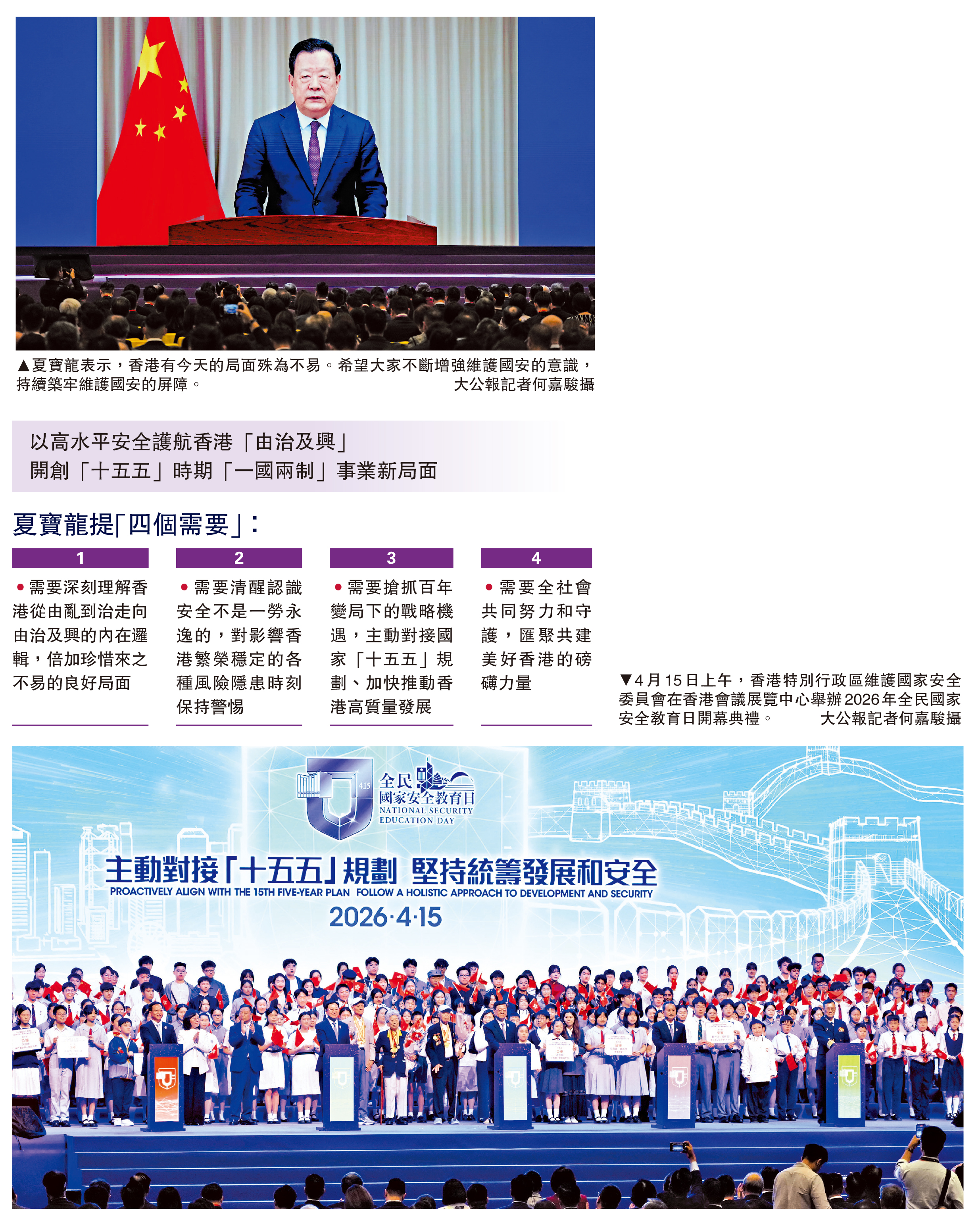 (大公報 記者 義昊)4月15日上午,香港特別行政區維護國家安全委員會在香港會議展覽中心舉辦2026年全民國家安全教育日開幕典禮。香港社會各界逾2300人出席活動。中央港澳工作辦公室主任、國務院港澳事務辦公室主任夏寶龍在開幕典禮上視頻致辭表示,要深入學習貫徹習近平主席重要講話精神,統籌發展和安全,以高水平安全護航香港由治及興,開創「十五五」時期「一國兩制」事業新局面。