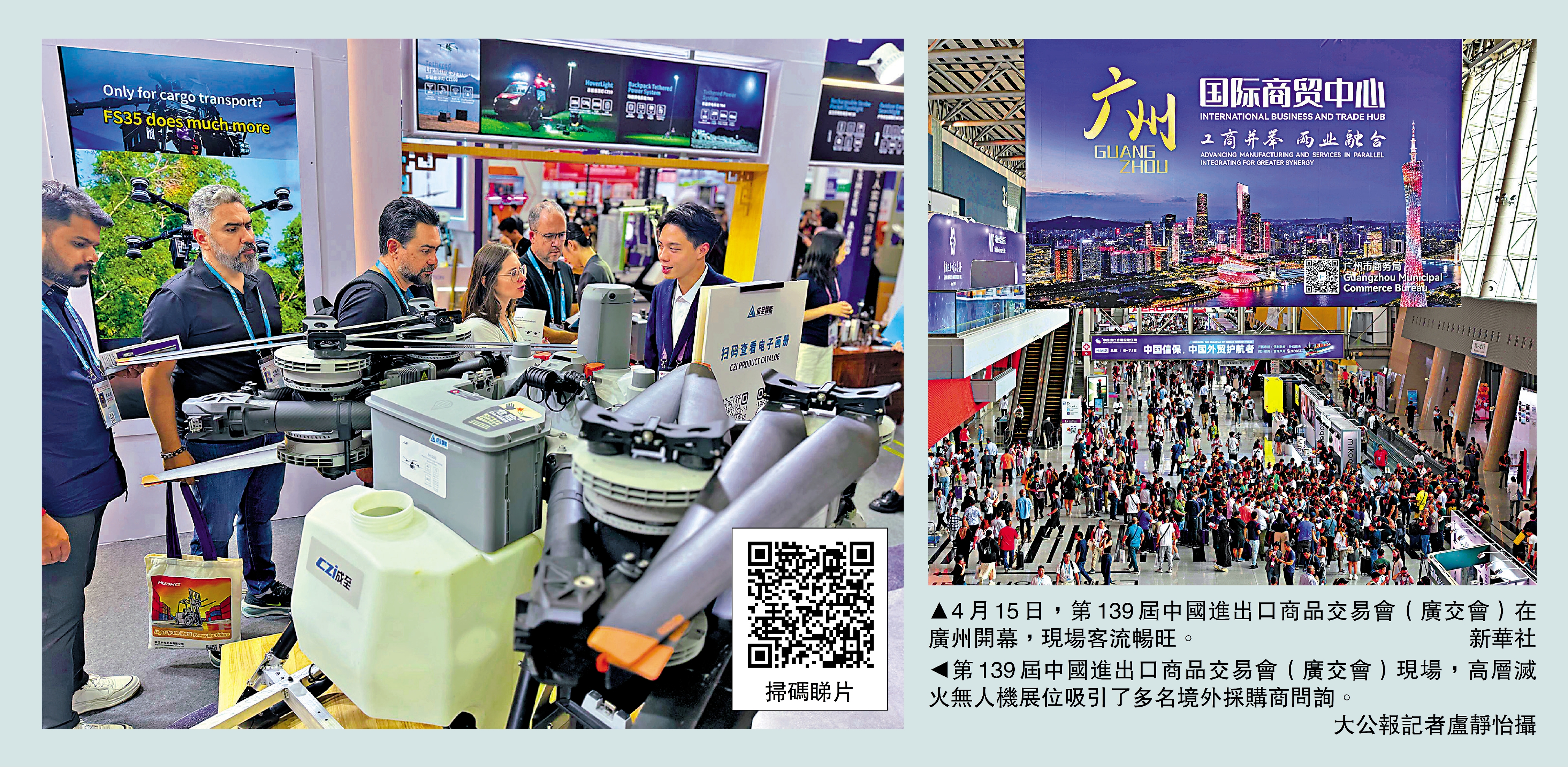 (大公報 記者 盧靜怡、帥誠 廣州報道)在全球經貿環境複雜多變、地緣衝突與供應鏈波動交織的背景下,15日在廣州開幕的第139屆廣交會吸引逾3.2萬家企業參展,規模再創歷屆新高,成為觀察中國外貿韌性與新動能的重要窗口。本屆廣交會首次設立「智能九區」,涵蓋無人機、智能穿戴等多個新興領域,展位超1300個,成為展會最受矚目的核心板塊之一。不少中東、南美採購商開展首日便果斷下單,其中可執行高層滅火的無人機吸引了多名中東客商駐足洽談,對中國智造讚不絕口。
