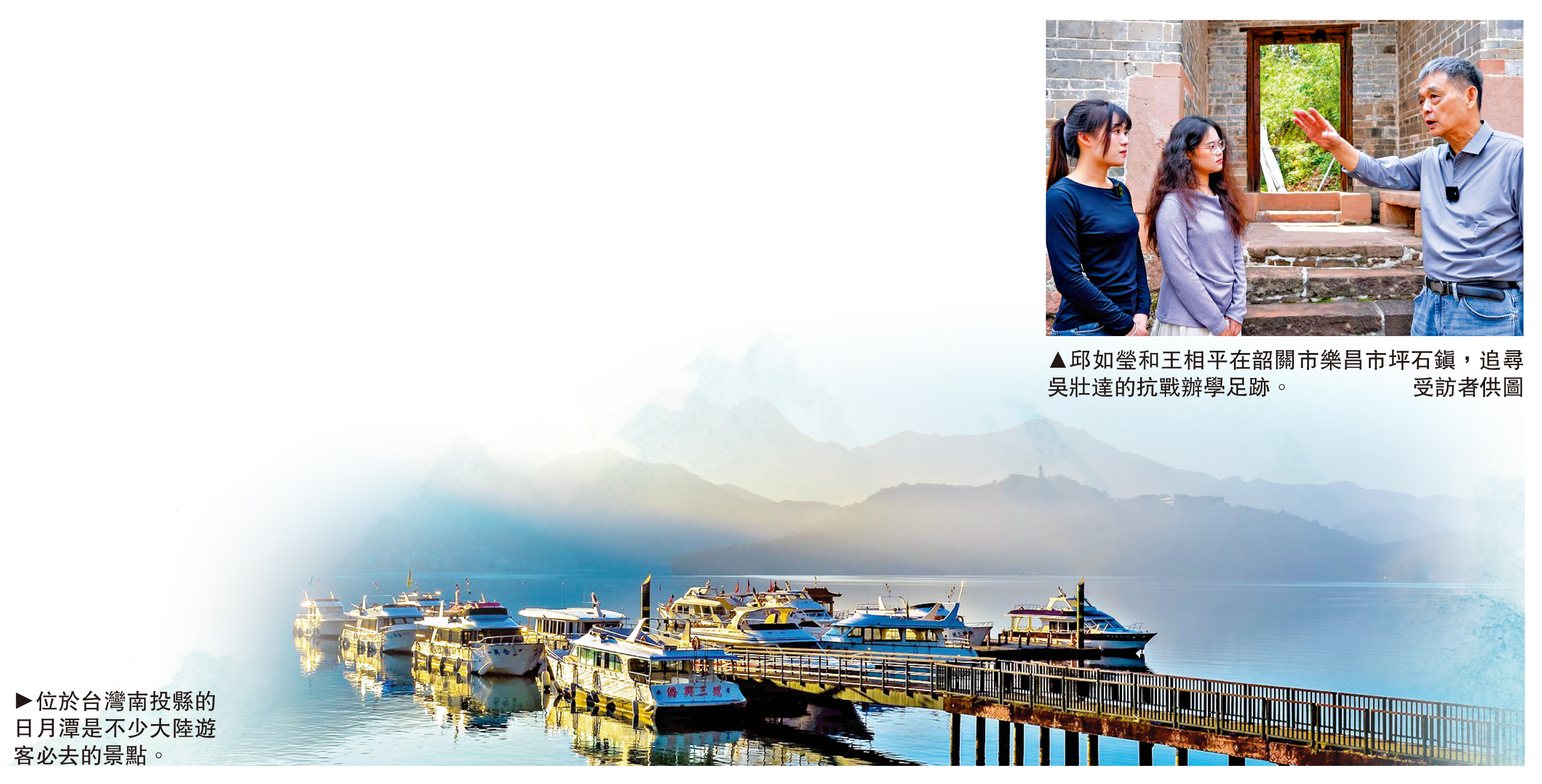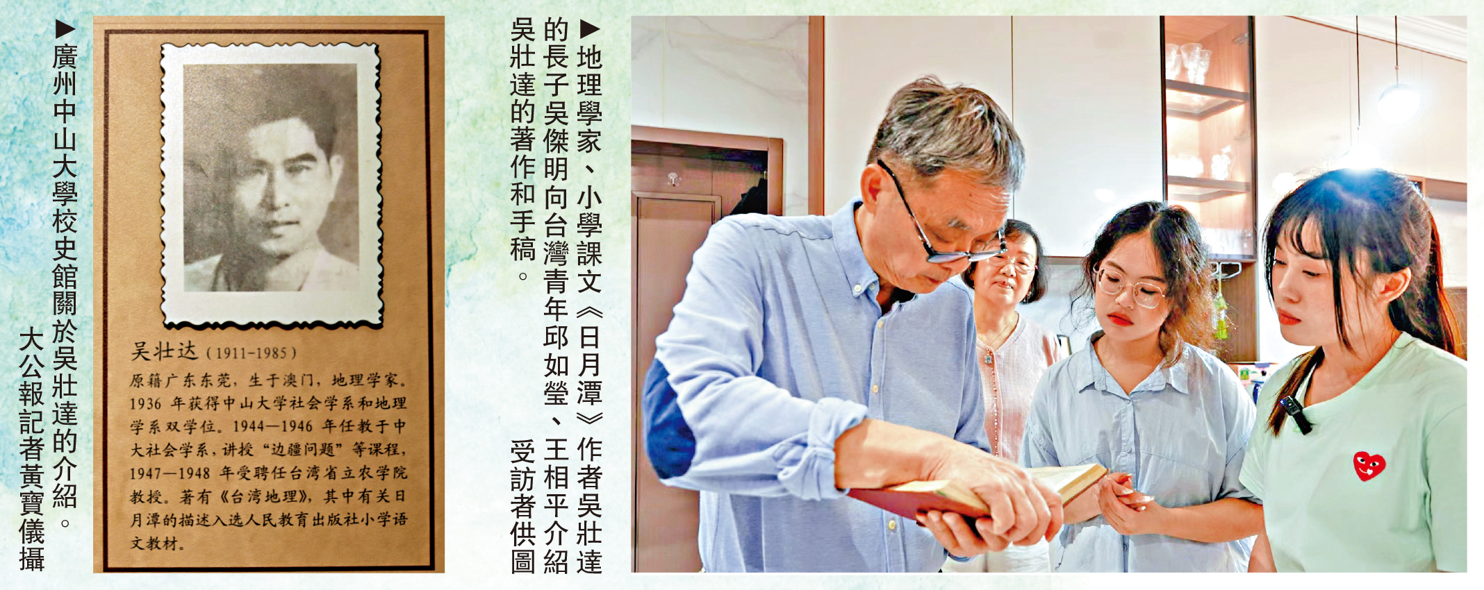 (大公報 記者 黃寶儀 廣州報道)「北邊像圓圓的太陽,叫日潭;南邊像彎彎的月亮,叫月潭。」一九四七年十一月,地理學家吳壯達踏上光復後的寶島台灣,用樸素而深情的文字寫下了這篇《日月潭》,該文章於上個世紀七十年代選編進小學語文教材。近日,就讀於武漢中南財經政法大學的台灣青年學生邱如瑩和王相平循着這篇課文,尋找作者吳壯達的印記,讓一段塵封的兩岸往事再次走進公眾視野。通過探尋吳壯達足跡,邱如瑩和王相平表示,「這讓我們看到,我們所熱愛的,是同一片土地!」
