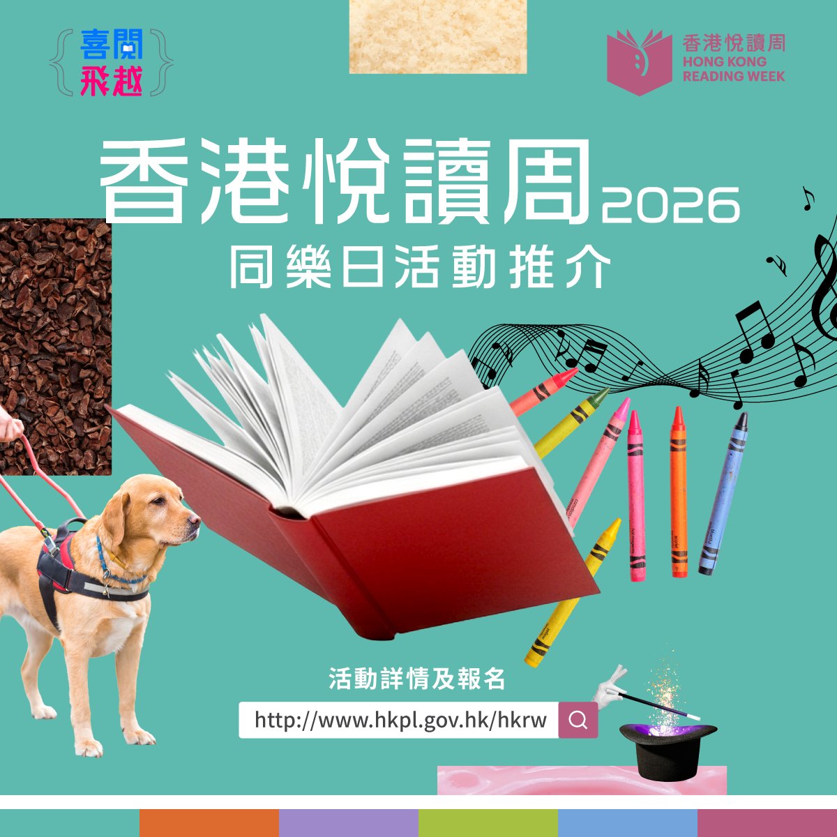 香港中央圖書館亦將於4月25日及26日舉行同樂日,多個精彩活動適合不同年齡的市民參與。包括歌手林奕匡主持的音樂故事分享會、王者匡「Harry 哥哥」的魔術表演和工作坊、導盲犬互動體驗、「細築香港」微型藝術展覽,以及由音樂事務處中西樂團聯袂演出經典樂曲的音樂匯演等。此外,現場將設置「尋醉書旅」互動裝置。