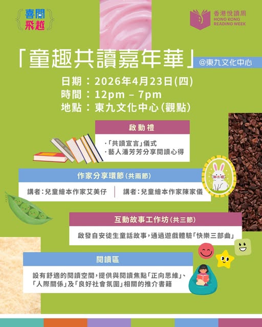 此外,「快閃圖書館@香港悅讀周2026」將於4月25日在九龍塘又一城商場舉行,活動以「幸福,『BOOK』見不散」為主題,向市民推廣閱讀文化。