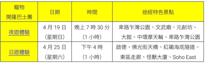 寵物開篷巴士團採取網上預約制,愛寵家庭可透過PET-A-HOOD預約行程,與愛寵一同留下難忘的觀光記憶。首發團訂於4月19日啟航,並首次以「夜遊」主題進行。本月及下月多個寵物開篷巴士團將陸續開放預約。