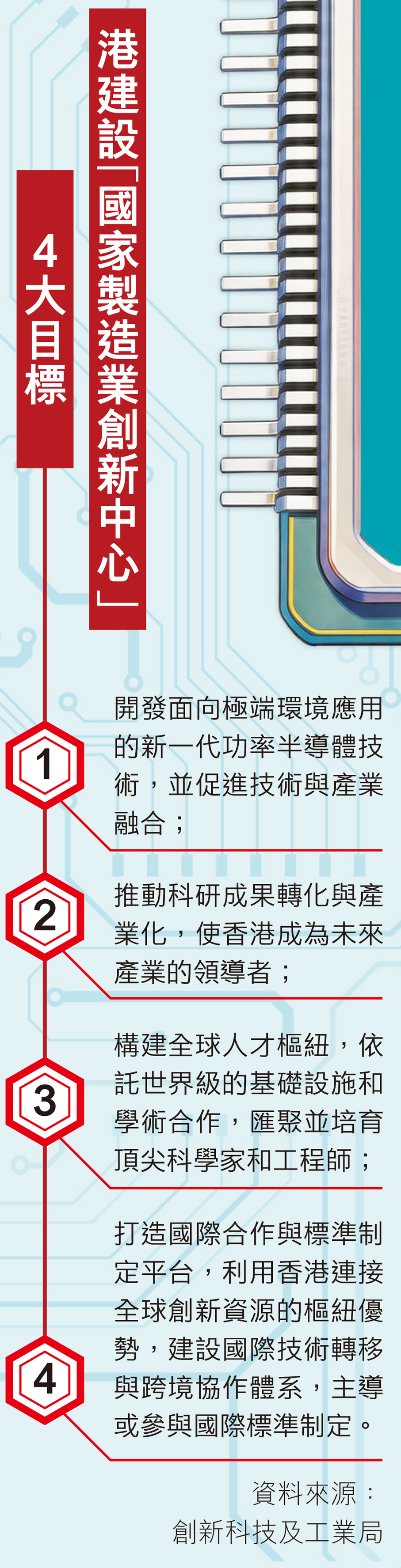 文件提到,香港正持續完善多元化半導體生態系統,在港設立首個境外國家製造業創新中心,協助大學及研發機構擴充共享設施與資源,並為工業界及先進製造業提供應用研發、測試與技術諮詢服務;除可帶動就業,亦有助推動關鍵技術突破、吸納國際人才,長遠鞏固香港產業與科技樞紐角色,推動經濟可持續增長。