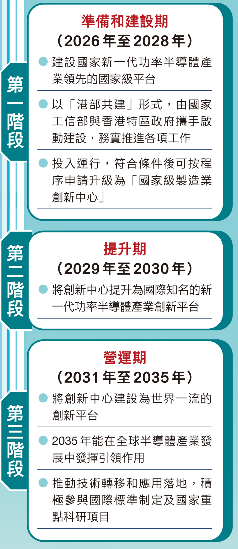 在發展路線上,中心擬採取分階段發展模式,今年會先以「港部共建」形式,由國家工信部與特區政府攜手啟動建設,務實推進各項工作;其後在2026年至2035年間按三個階段有序落實,並設定明確量化里程碑與戰略成果,包括在滿足條件後按程序申請升級「國家級」製造業創新中心。文件估算中心首三年總成本約4.4億元,主要用於設備購置等。創科局計劃於今年下半年向立法會財委會申請撥款約2.2億元,其餘開支將由創新中心透過業界籌措資金,以及在營運期承接產業服務創收分擔,初步預計營運三年後可實現自負盈虧,並於第五年起逐步實現盈利。