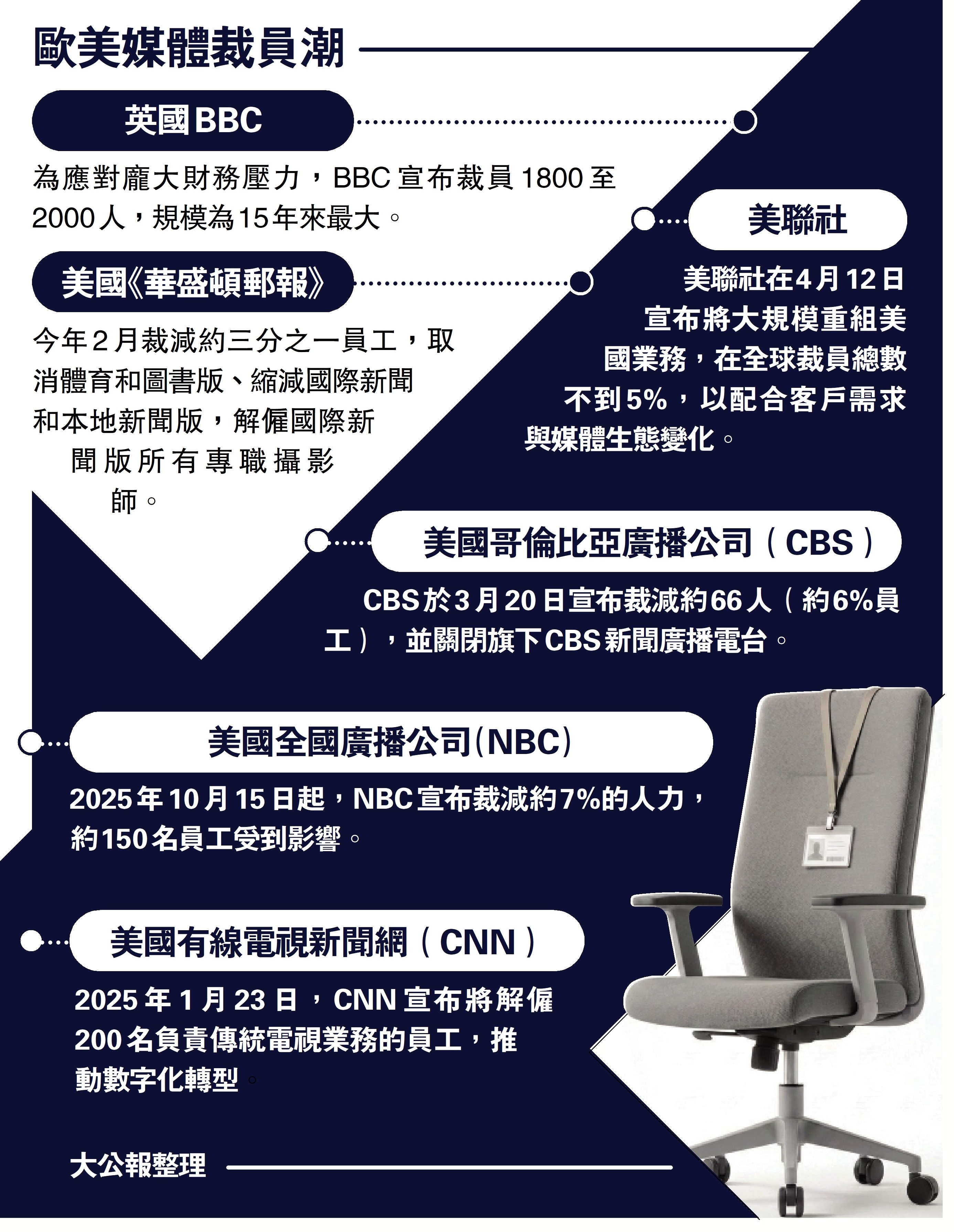美國哥倫比亞廣播公司(CBS)、美國全國廣播公司(NBC)和美聯社在上月和本月也分別宣布裁員和業務重組。