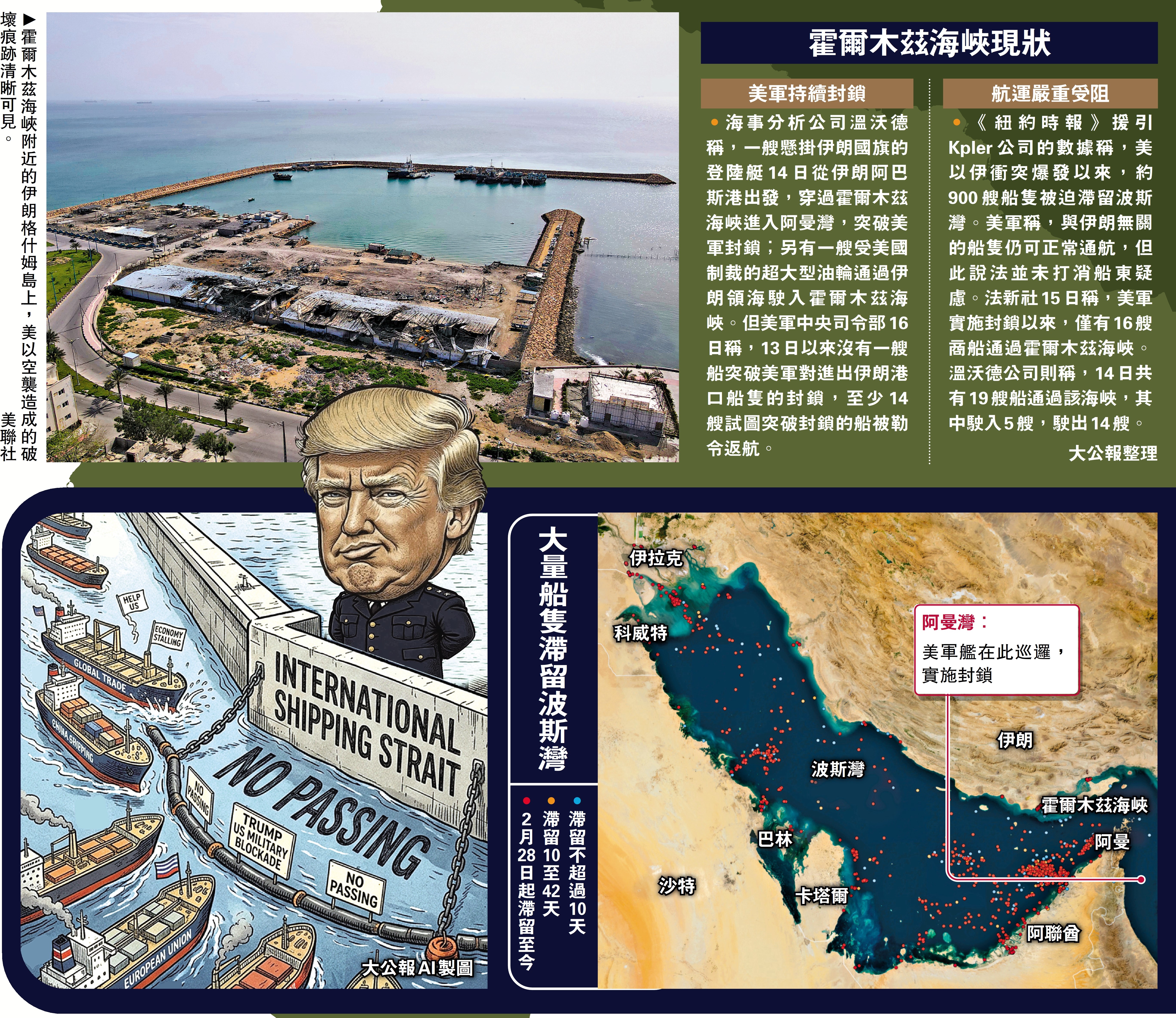 美軍13日起對所有進出伊朗港口的船隻實施封鎖,逾萬名美軍士兵和十多艘軍艦在阿曼灣和阿拉伯海等地參與行動,霍爾木茲海峽航運面臨新的不確定性。凱恩16日稱,截至當天上午美軍尚未登臨任何船隻。美軍中央司令部稱,沒有一艘船突破封鎖,已有14艘船聽從美軍命令掉頭返航。但英國海事分析公司溫沃德稱,一艘懸掛伊朗國旗的登陸艇14日從伊朗阿巴斯港出發,穿過霍爾木茲海峽進入阿曼灣,突破美軍封鎖;另一艘受美國制裁的超大型油輪通過伊朗領海駛入霍爾木茲海峽。