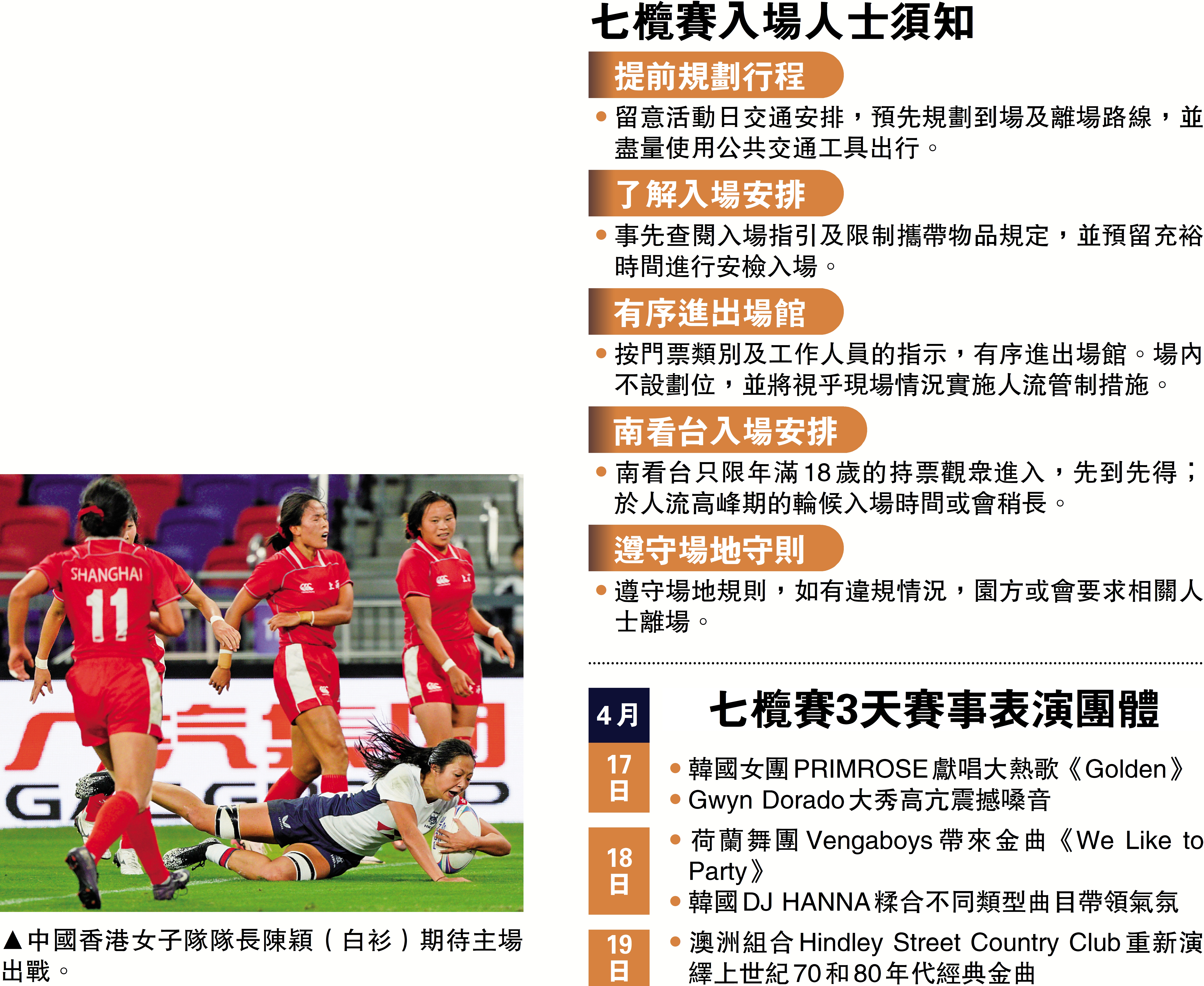 此外,世界七人欖球錦標賽將在今天主場館首次展開,去年勇奪香港國際七欖賽男子組冠軍的阿根廷隊將在首天的揭幕戰對陣西班牙隊,期望以勝利開啟爭取衛冕之路。力爭4連冠的新西蘭女子隊則在首天出戰兩仗,分別對陣巴西隊及日本。
