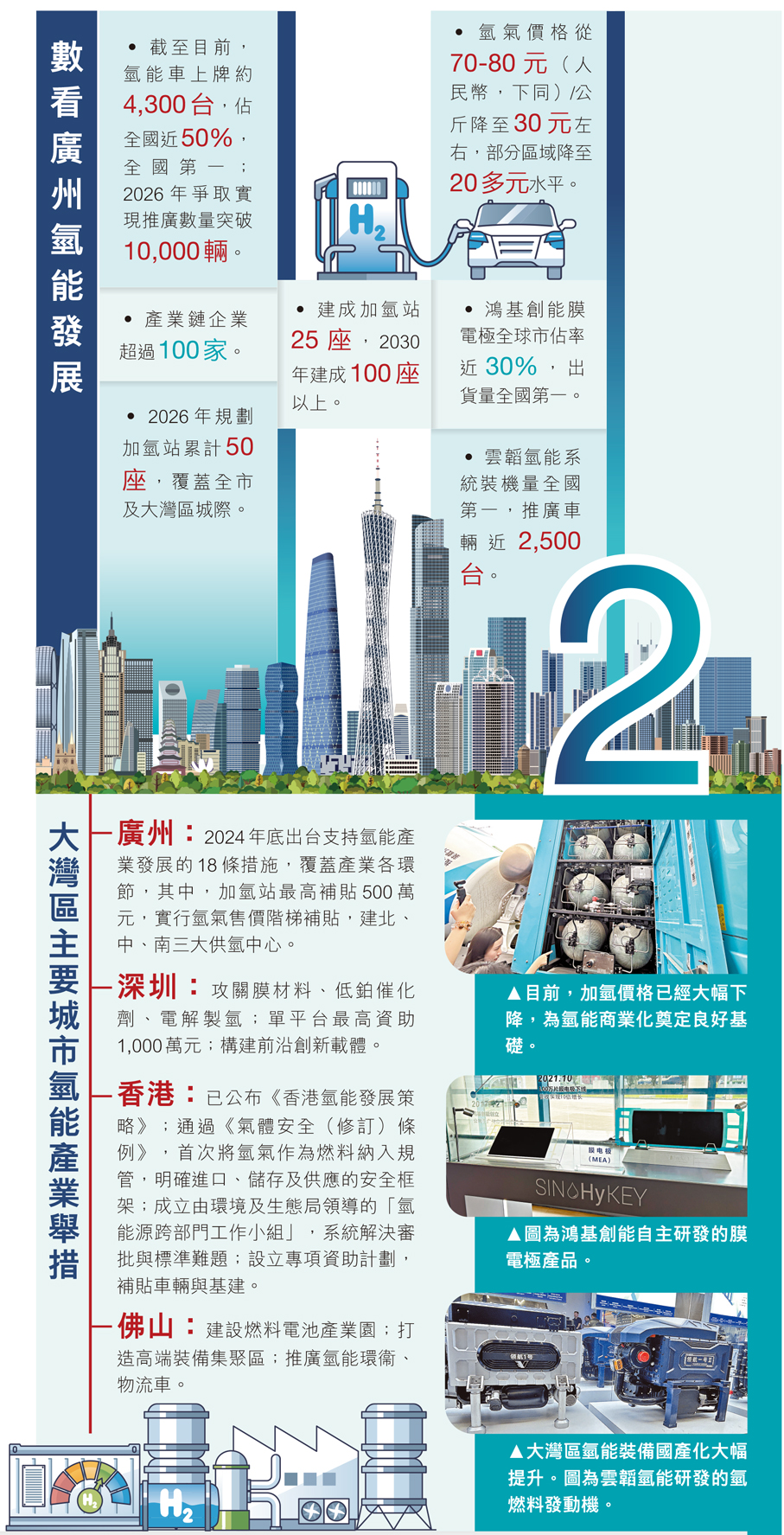 (香港文匯報記者 敖敏輝)國家「十五五」規劃綱要提出,推動氫能、核聚變能等成為新的經濟增長點。今年以來,內地氫能產業正加速從技術示範探索,邁入規模化、商業化發展的新階段。以廣州為代表的大灣區城市在氫能商業化運用方面位居全國前列。香港文匯報記者近日走訪廣州多家氫能產業鏈頭部企業發現,廣州已形成氫能製、儲、運、用完整的產業鏈閉環,關鍵零部件實現100%國產化,製氫、用氫成本大幅下降。業界預期,在當地政府助力與市場驅動的雙重推動下,廣州有望成為內地氫能商業化「第一城」。放眼粵港澳大灣區,業界普遍認為,大灣區在氫能製儲運、人才、金融、貿易以及跨境聯合創新等方面優勢明顯,有望發展成為中國氫能產業重要龍頭。