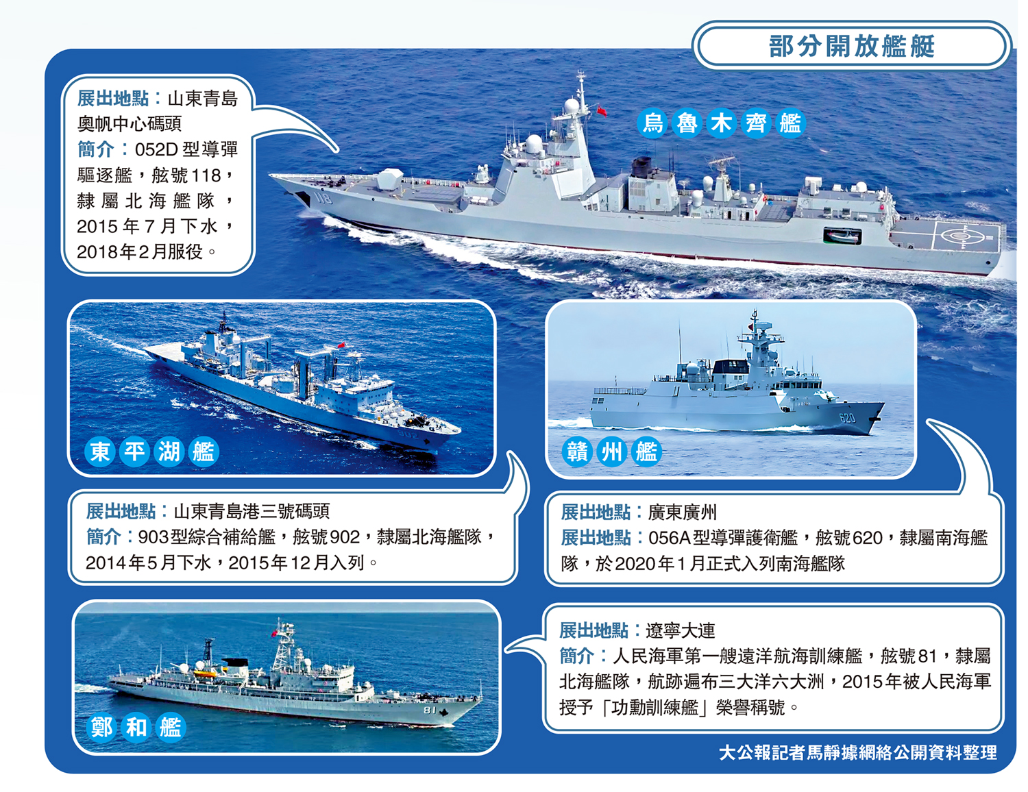 據報道,此次面向公眾開放的艦艇,除052D型、956型導彈驅逐艦,053H3型、054A型、056A型導彈護衛艦,081型掃雷艦,022型導彈艇,071型綜合登陸艦等多型現役戰鬥艦艇外,還包括綜合補給艦、遠洋航海訓練艦、海洋綜合調查船、綜合援潛救生船、醫院船等現役輔助艦船。開放地點包括大連、東營、青島、連雲港、泰州、南通、上海、寧波、舟山、寧德、廈門、汕頭、廣州、湛江、儋州、三亞等城市。