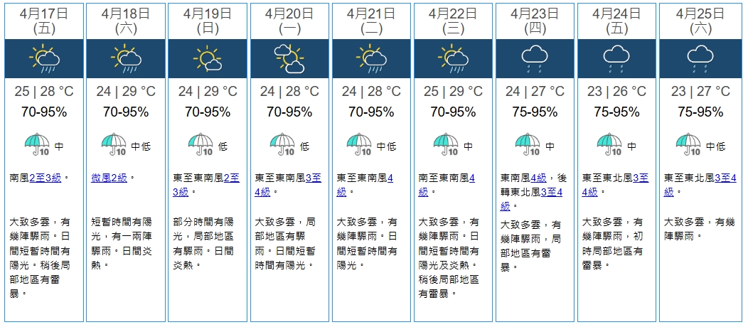 天文台展望,下周初華南沿岸仍有幾陣驟雨。而另一道低壓槽將在下周中後期抵達,屆時天氣將進一步轉差。預測下周三至周五(22日至24日)大致多雲,且局部地區有雷暴,氣溫亦會略為回落,介乎23度至27度。由於未來九日相對濕度上限料均達95%,天氣將顯得較為潮濕悶熱。