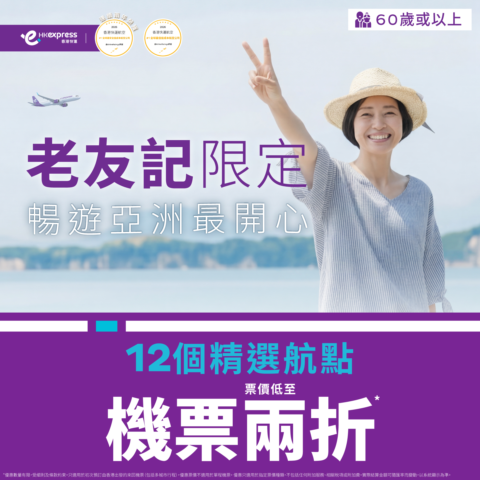 大公文匯全媒體報道,香港快運(HK Express)今日(17日)宣布,推出「60+老友記限定兩折優惠」,由即日起至4月20日晚上11時45分,年滿60歲或以上的香港及澳門居民,於HK Express指定優惠訂購專頁預訂航班,並於2026年4月27日至2026年10月24日期間出發,即可享優惠票價購買來回機票。