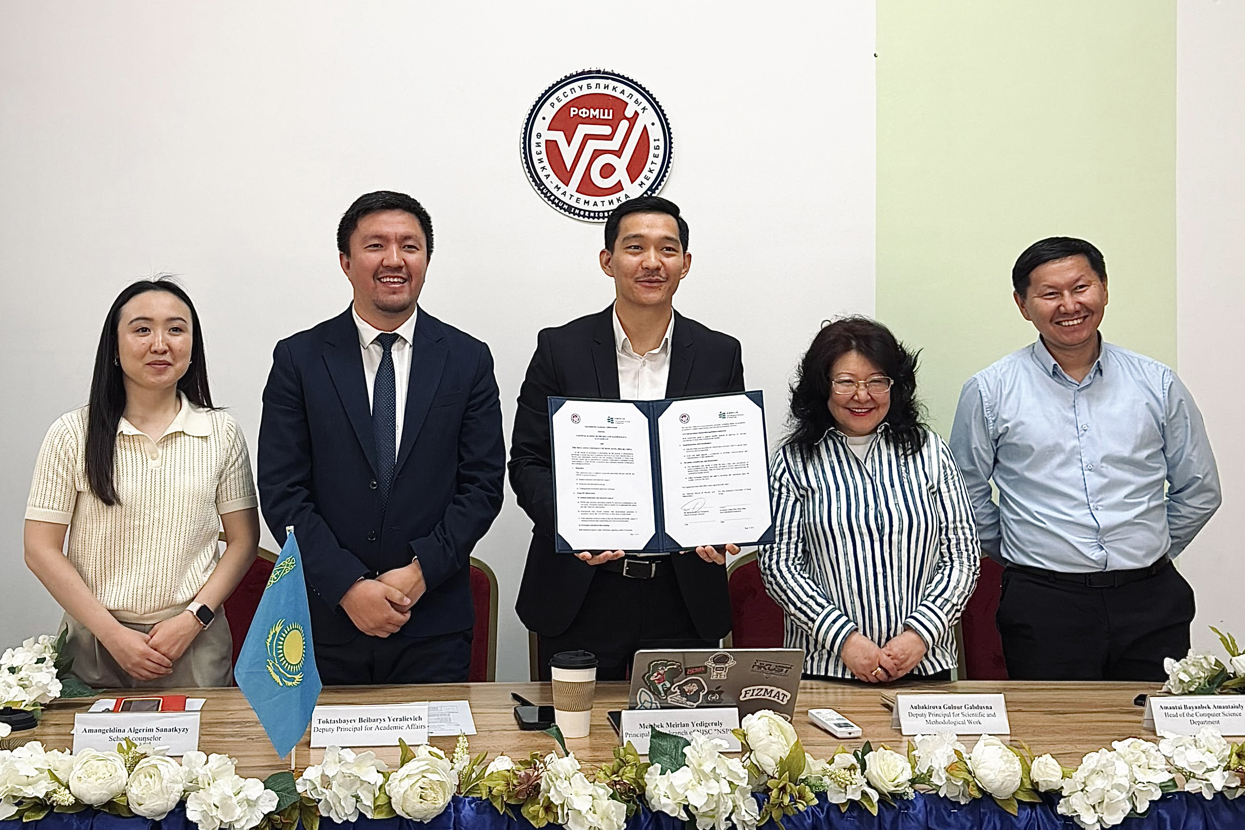 教大副校長(學術)鄭美紅教授與國立物理數學學校阿拉木圖校區校長Meirbek Meirlan先生分別代表兩校簽署合作備忘錄。教大代表包括科學與環境學系署理系主任鄧文靖博士、何詠基教授、數學與資訊科技學系署理系主任凌萬豪博士,以及高級助理教務長(入學及策劃)梁慧兒博士。國立物理數學學校代表包括科研與教學工作副校長Aubakirova Gulnur Gabduvna女士、教務副校長Toktasbayev Beibarys Yeralievich先生、計算機科學系主任Amantai Bayanbek Amantaiuly先生, 與學校輔導員Aigerim Amangeldina女士。