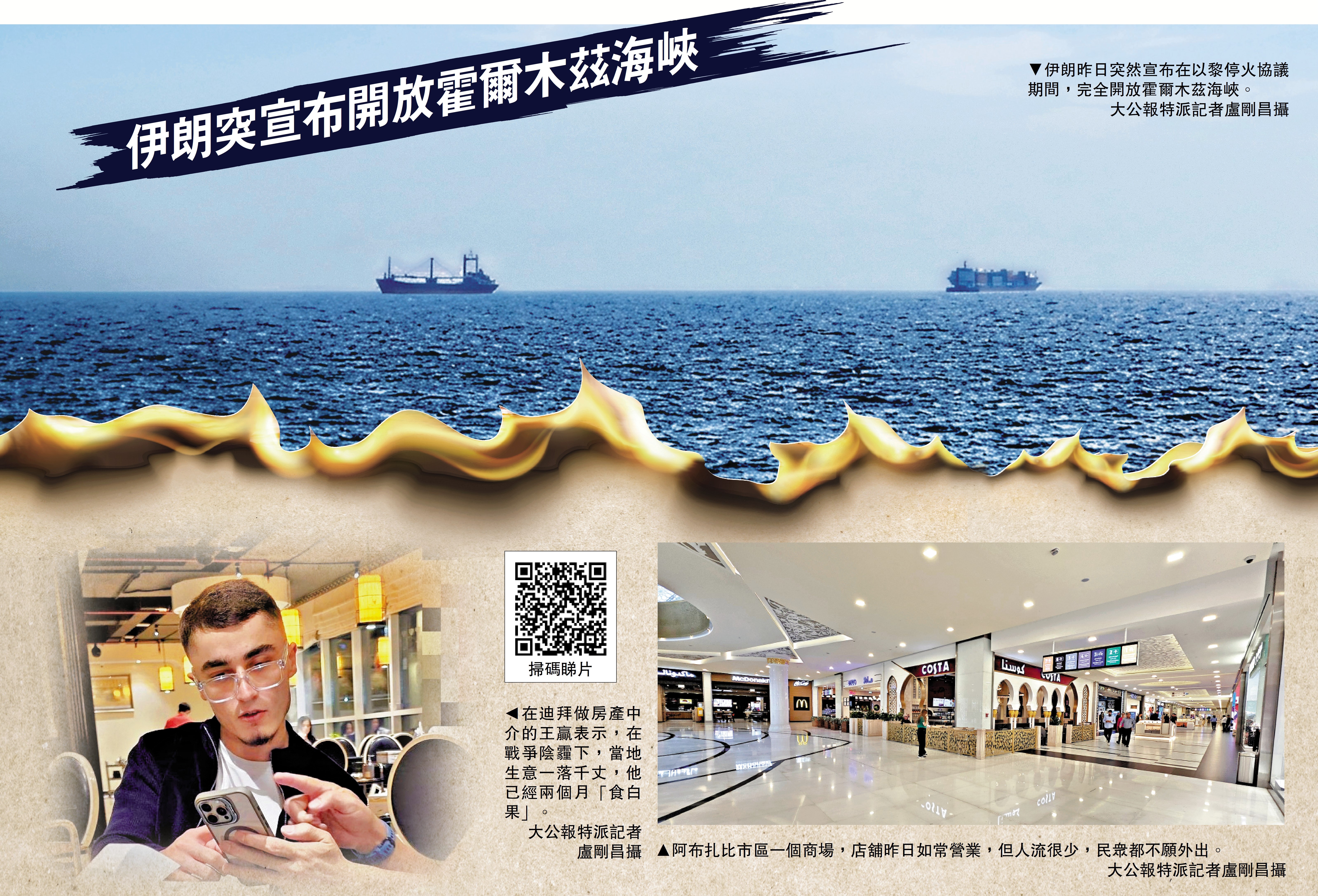 在阿布扎比市區的一間餐廳,大公報記者昨日訪問了一位從事房地產中介的俄羅斯青年王贏,略懂中文的他長期在迪拜打拚,現時生意一落千丈,遠在俄羅斯家鄉的父母要求他早日離開,但他舉棋不定,他對開放海峽表示開心,祈求早日恢復和平。他說有相熟的中東有錢人往香港跑,他也羨慕沒有戰火的中國,考慮今後到上海定居。
