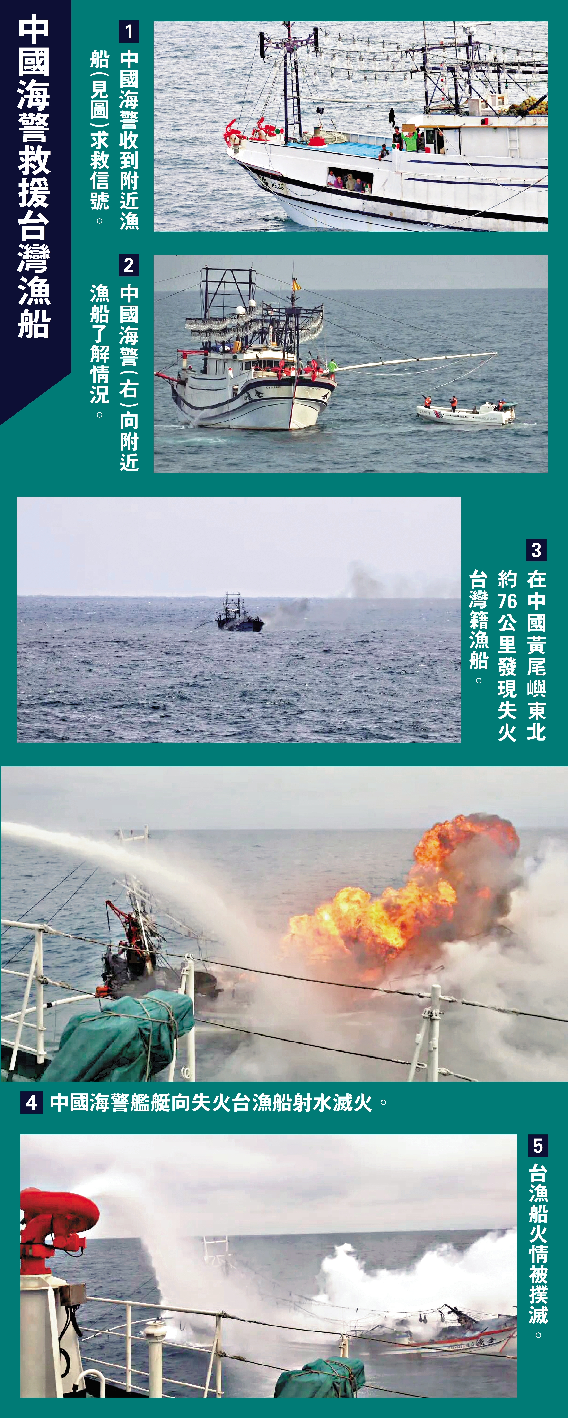 中國海警發布了此次救援台灣籍漁船的現場圖片。中國海警首先收到了附近漁船(金漁NO.36)發出的求救信號,有漁民手舉標識牌向中國海警求助。隨後,中國海警派出小艇靠近該漁船了解情況。後續,中國海警發現失火漁船。圖片顯示,漁船上火勢巨大,海警艦艇對失火漁船進行滅火作業。後續,漁船火情被撲滅,圖片顯示漁船的損失相當慘重。