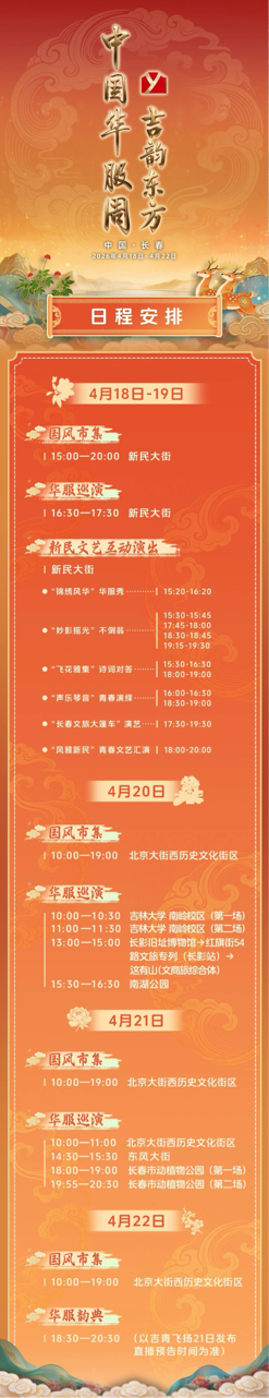 「風雅新民」青春文藝匯演將於18日至19日18時至20時舉行,多所高校將帶來舞蹈、民樂、京劇等節目,展現青春氣息與古風韻味的碰撞。4月20日至22日,活動還將陸續走進北京大街西歷史文化街區、吉林大學南嶺校區、長影舊址博物館、紅旗街54路文旅專列、這有山、南湖公園及長春市動植物公園等城市文化地標,持續舉辦華服巡演活動。