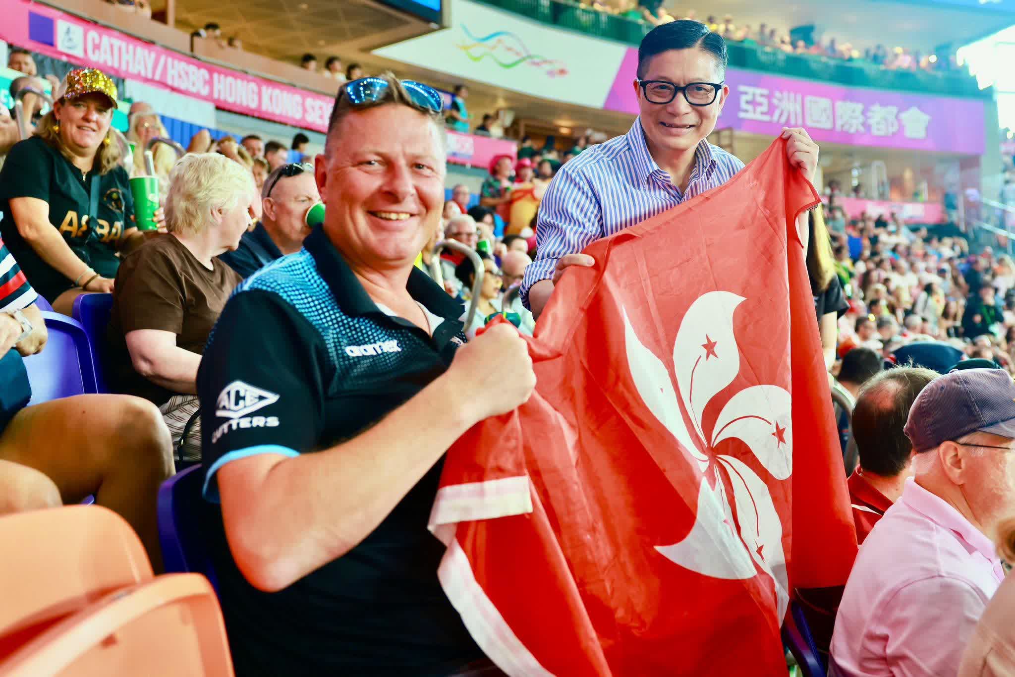 大公文匯全媒體報道,香港國際七人欖球賽今日(18日)進行第二天賽事,球迷必爭之地南看台爆滿,要實施人流管制。期間,保安局局長鄧炳強到場視察人流管理和維持秩序的情況,又走入南看台與球迷交流和合照,親身支持該項年度盛事。