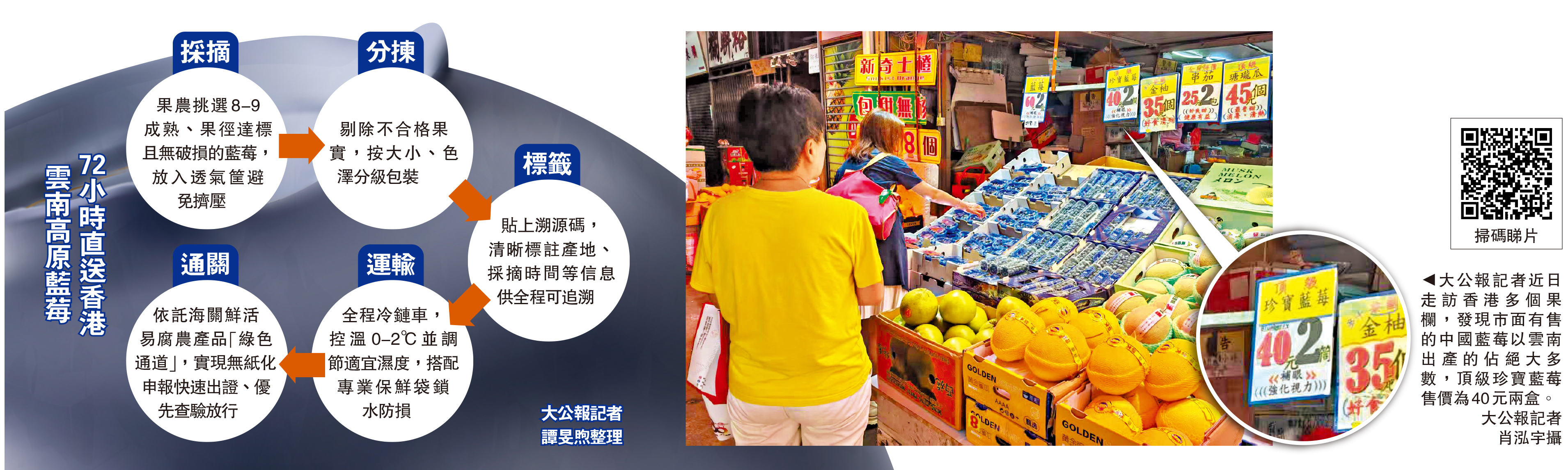 (大公報記者 譚旻煦、肖泓宇)「中國珍寶裝藍莓,40蚊兩盒包甜,新到貨新開箱。」走進香港鬧市大大小小的果欄,如藍寶石般亮麗的中國產藍莓吸引不少市民購買,一位市民向大公報記者說:「中國藍莓抵食過美澳出產,爽口清甜帶花香,平到你唔信。」