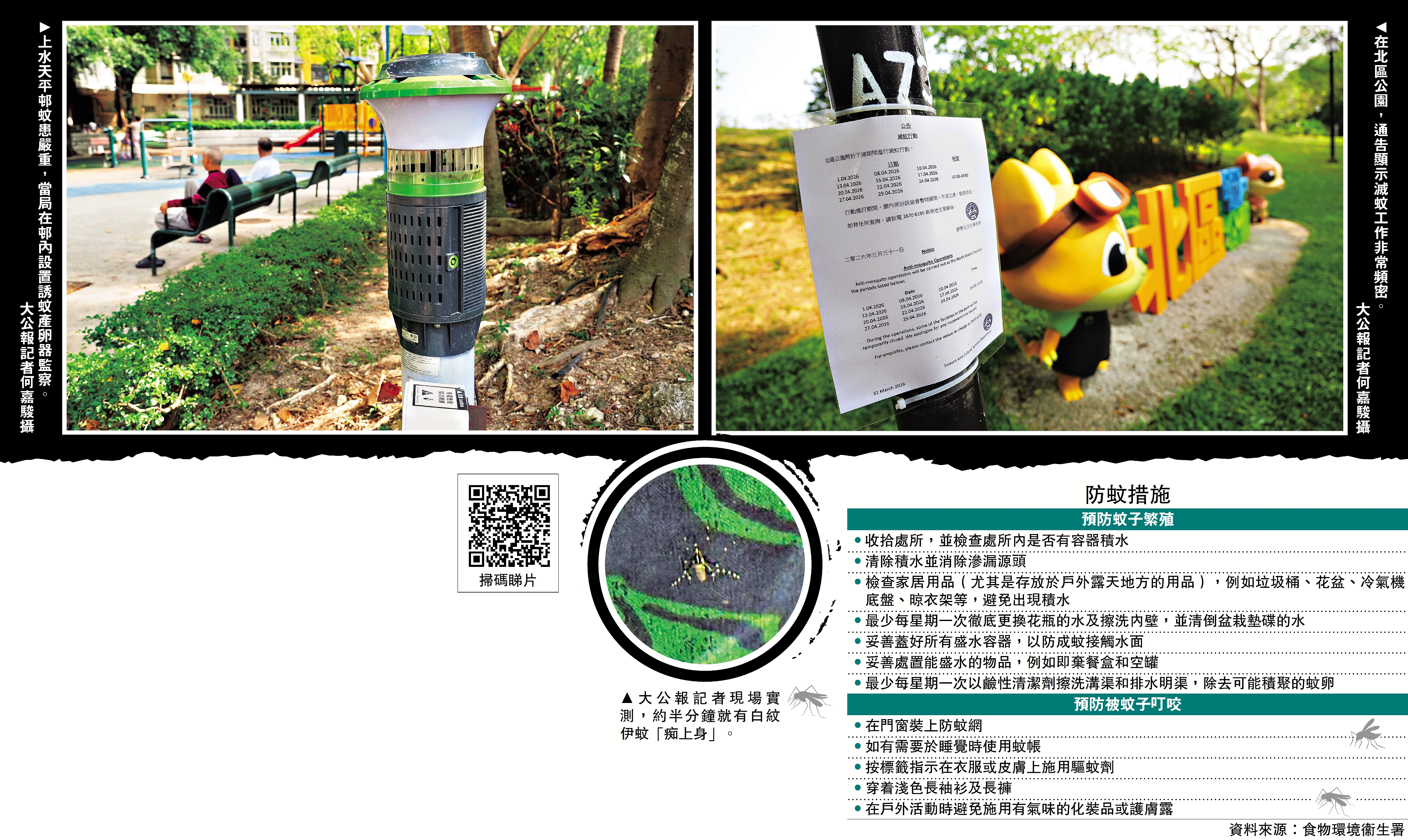 (大公報記者 張騰)春天溫暖潮濕,易生蚊患,食物環境衞生署近日公布4月份第二批白紋伊蚊誘蚊器指數顯示,北區上水第一階段誘蚊器指數突破20%的警戒線,巡查發現上水天平邨有蚊子滋生情況,該邨物管公司被檢控。
