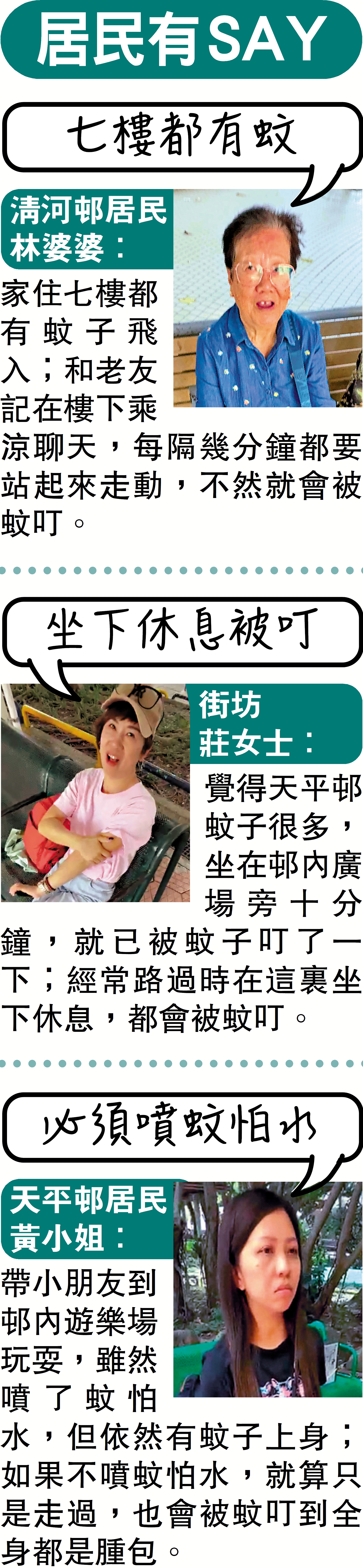 在天平邨露天劇場旁休息的街坊莊女士說,坐了十分鐘已經被蚊叮幾下,她一邊抓撓手臂上的蚊叮痕癢,一邊說這裏蚊患嚴重。在邨內遊樂場,不少居民帶着小朋友到來玩耍,身上都有蚊怕水味道。居民黃女士表示,邨內「不嬲都多蚊」,來玩前已為自己和小朋友噴蚊怕水,並說如果不噴蚊怕水,會「成身都係」蚊子,就算噴了蚊怕水也會有蚊「痴上身」。