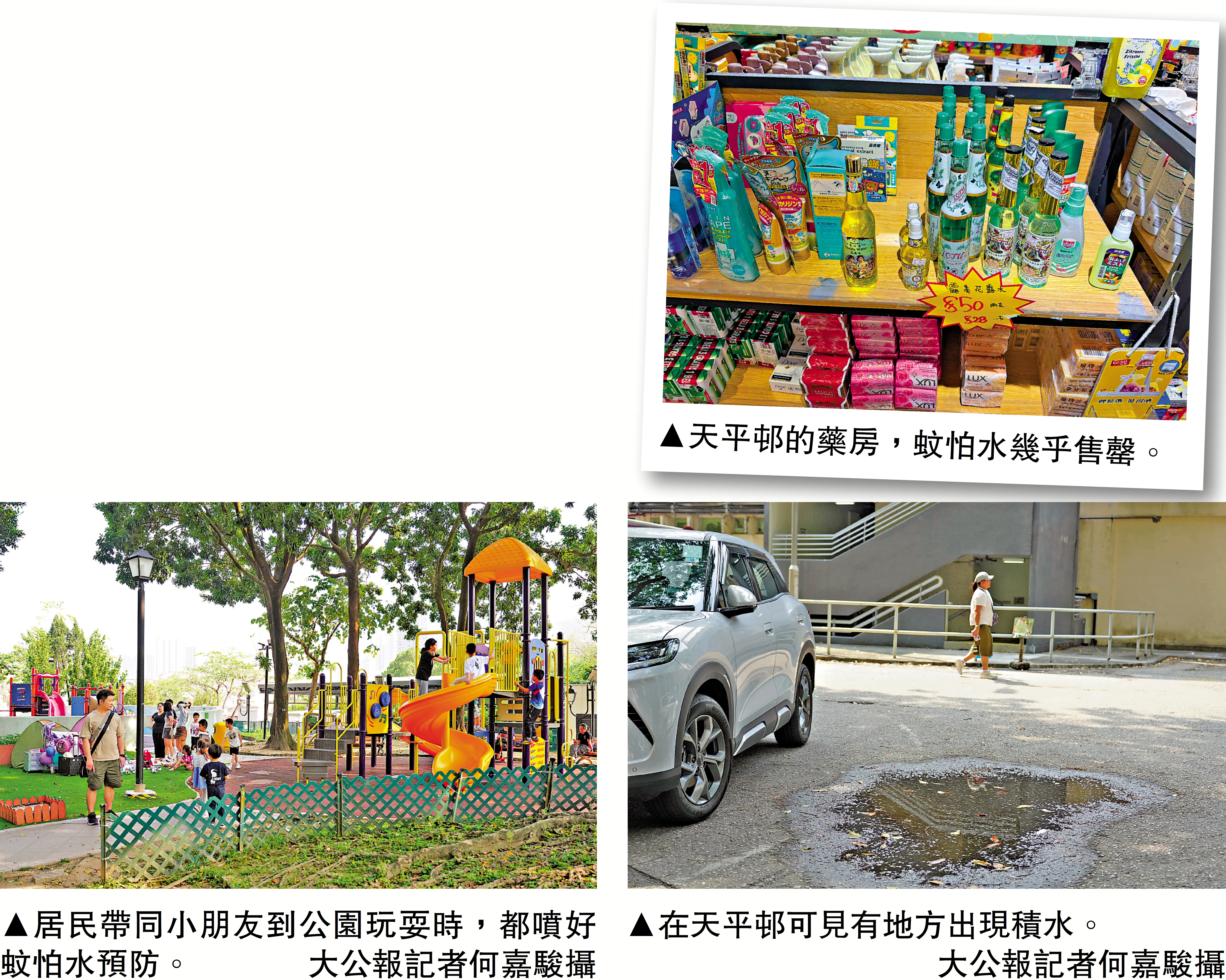 大公報記者到天平邨的遊樂場、露天劇場等草木較多位置,在不噴蚊怕水的情況下實測,在露天劇場旁靜立半分鐘,已有4、5隻蚊落在記者身上各處,記者要「手舞足蹈」才能趕走蚊子。