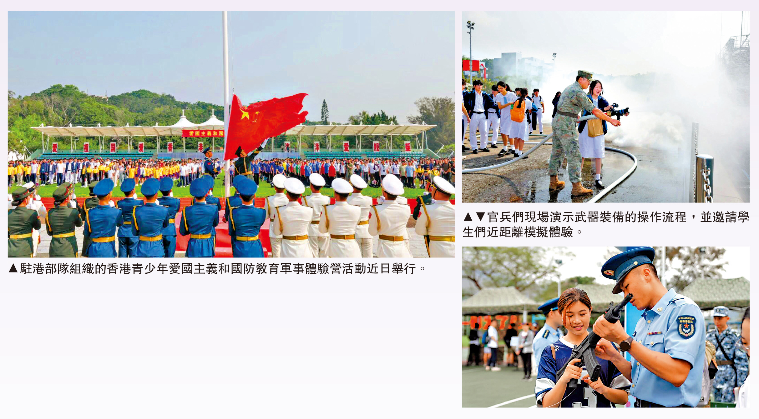 大公報報道,近日,駐香港部隊組織香港青少年愛國主義和國防教育軍事體驗營活動,近2000名香港青少年走進駐香港部隊石崗軍營和昂船洲軍營,通過參觀見學、體驗軍事課目等具有軍營特色的活動,增進對國防和軍隊的了解,強化國家認同感和民族自豪感,厚植愛國愛港情懷。
