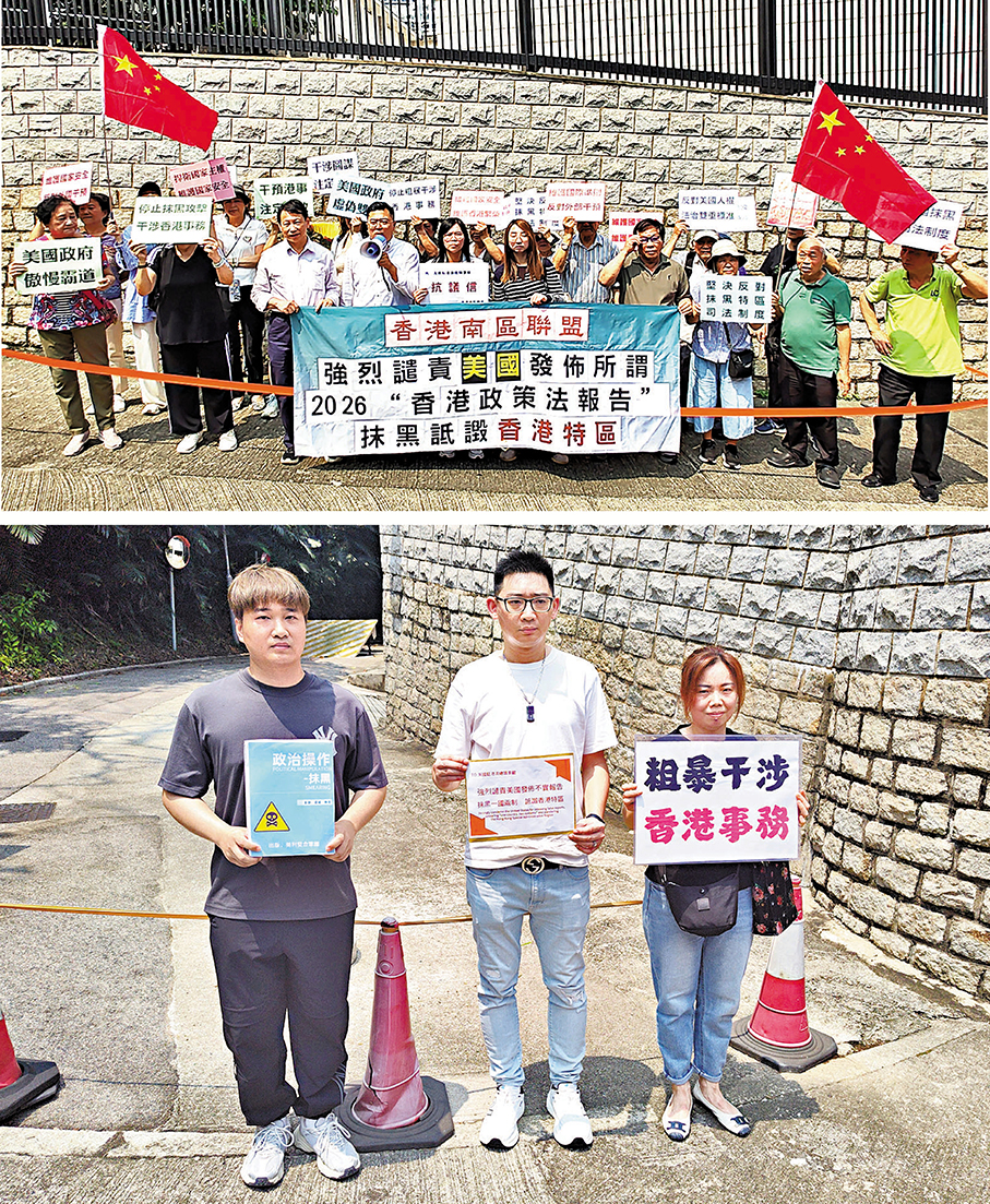 (香港文匯報記者 嚴鍇華)美國近日發表所謂2026年「香港政策法報告」,其中刻意顛倒是非,污衊抹黑香港特區,引起全城憤怒。多位香港市民及團體昨日到美國駐港總領事館外抗議,批評美國試圖詆毀「一國兩制」,抹黑香港國安法與法治人權,以卑劣政治操弄妄圖干預香港特區政府依法施政,充分暴露美國霸道嘴臉和「以港遏華」險惡用心,他們對此表示強烈不滿和堅決反對。