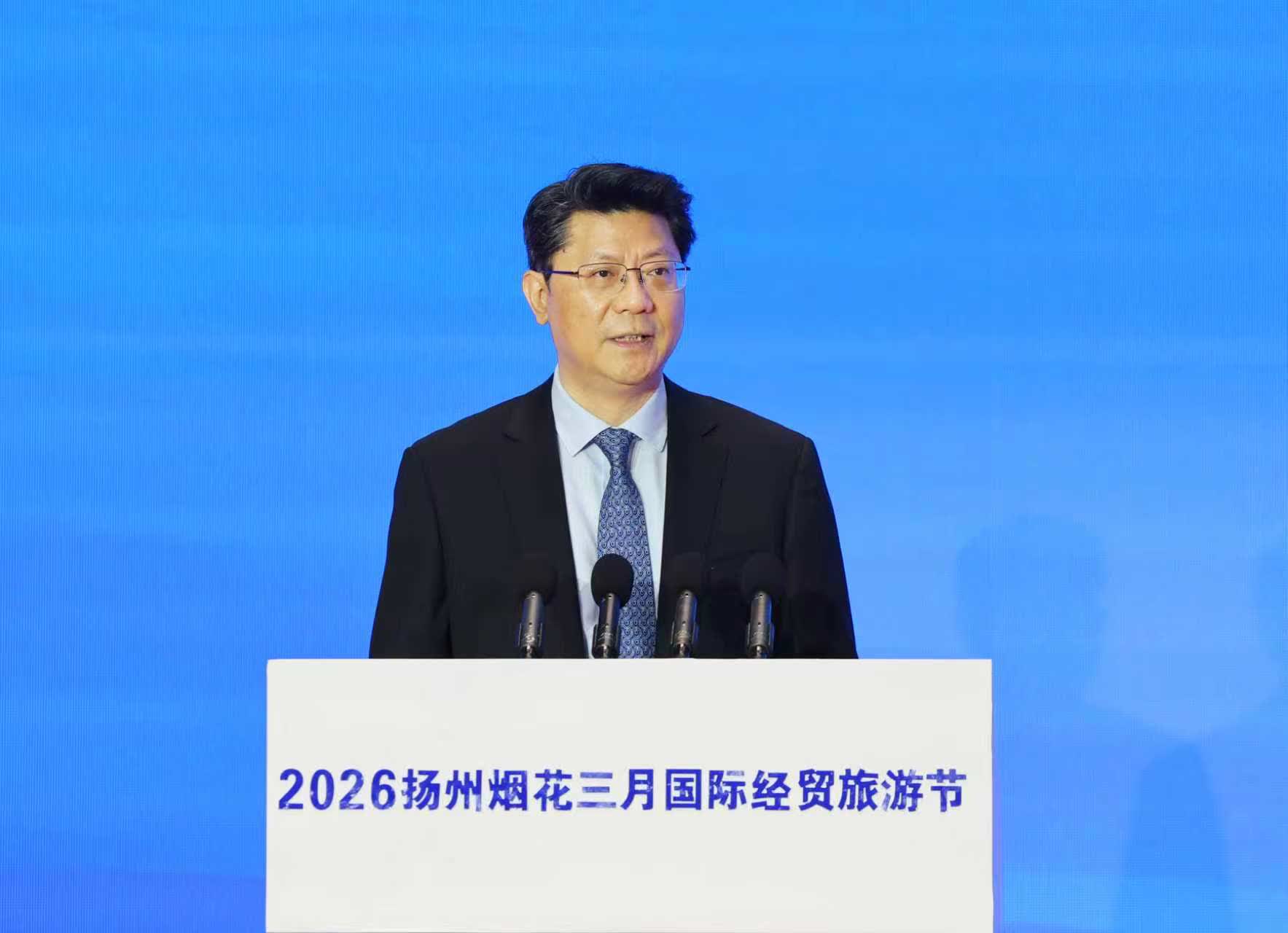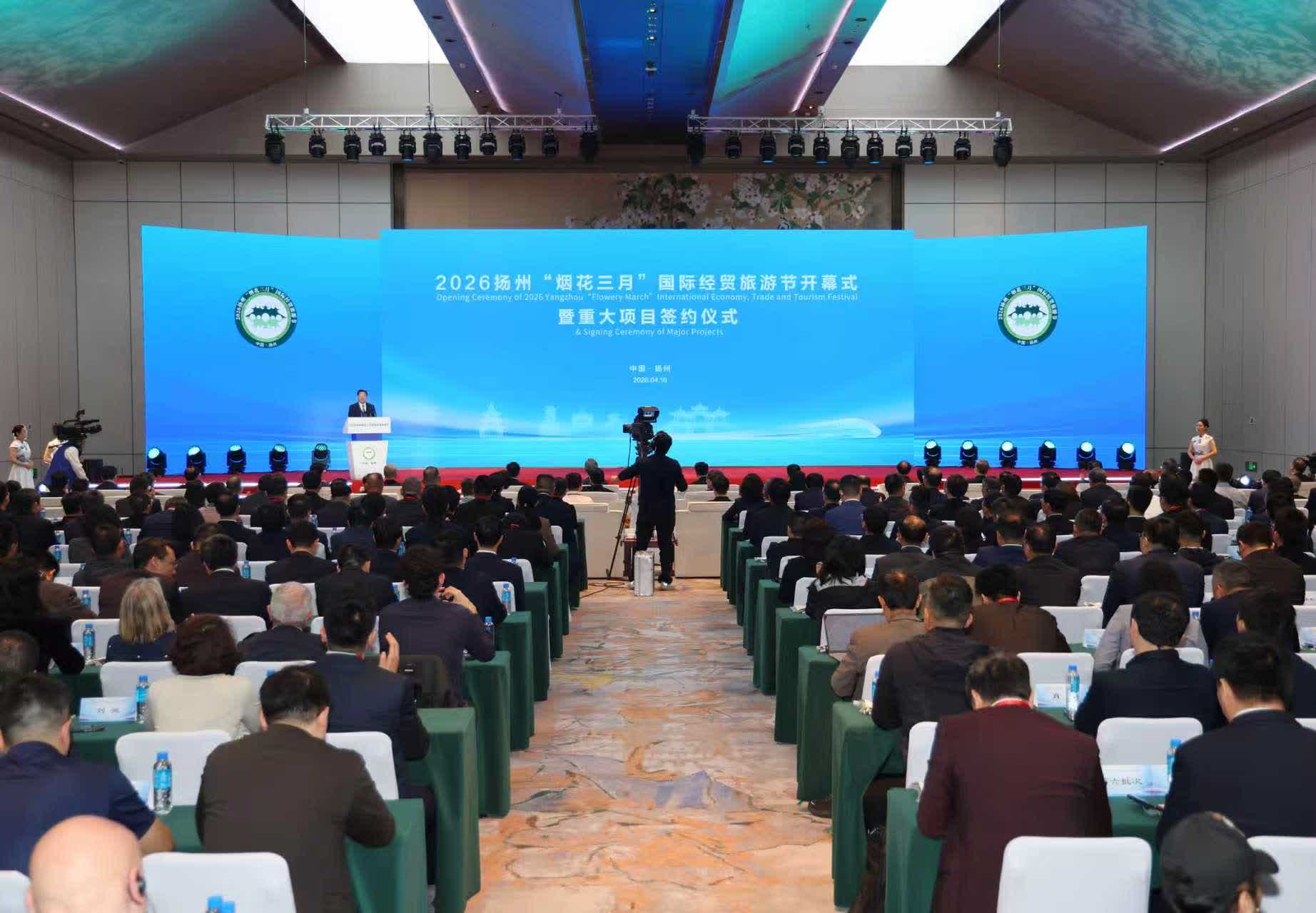 4月18日上午,2026揚州「煙花三月」國際經貿旅遊節開幕式在古運河畔舉行。韓國駐華大使盧載憲,埃及駐華大使哈立德·納茲米,柬埔寨磅通省省長農帕拉,中國能源建設集團有限公司黨委委員、總經濟師周小能,國際電信聯盟前秘書長趙厚麟,香港太平紳士、東海聯合(集團)董事局主席黃楚標,大灣區航空董事、香港特別行政區第七屆立法會主席梁君彥等出席。